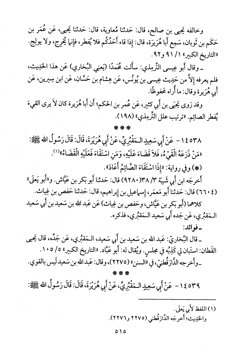١٤٥٣٩ - عن أبي سعيد المَقبُري، عن أبي هريرة، قال: قال رسول الله صَلى الله عَليه وسَلم: