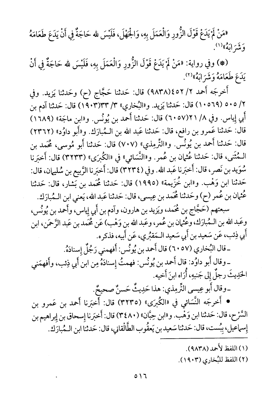 «من لم يدع قول الزور والعمل به، والجهل في الصوم، فليس لله حاجة في ترك طعامه وشرابه» (¬١).