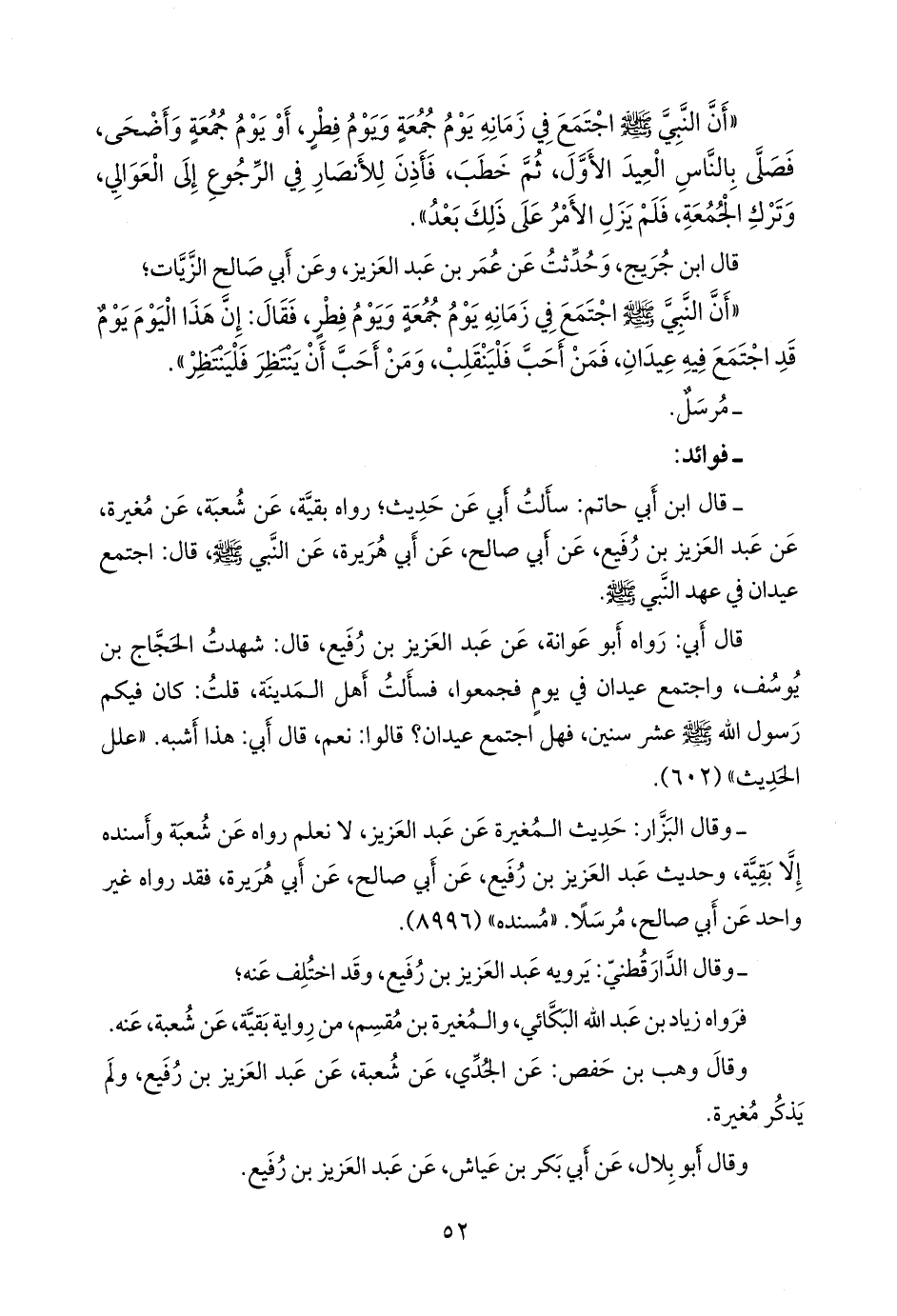 - وقال ابن أبي حاتم: سألتُ أبي عن حديثٍ؛ رواه بقية، عن شعبة، عن مغيرة، عن عبد العزيز بن رفيع، عن أبي صالح، عن أبي هريرة، عن النبي صَلى الله عَليه وسَلم قال: اجتمع عيدان في عهد النبي صَلى الله عَليه وسَلم.