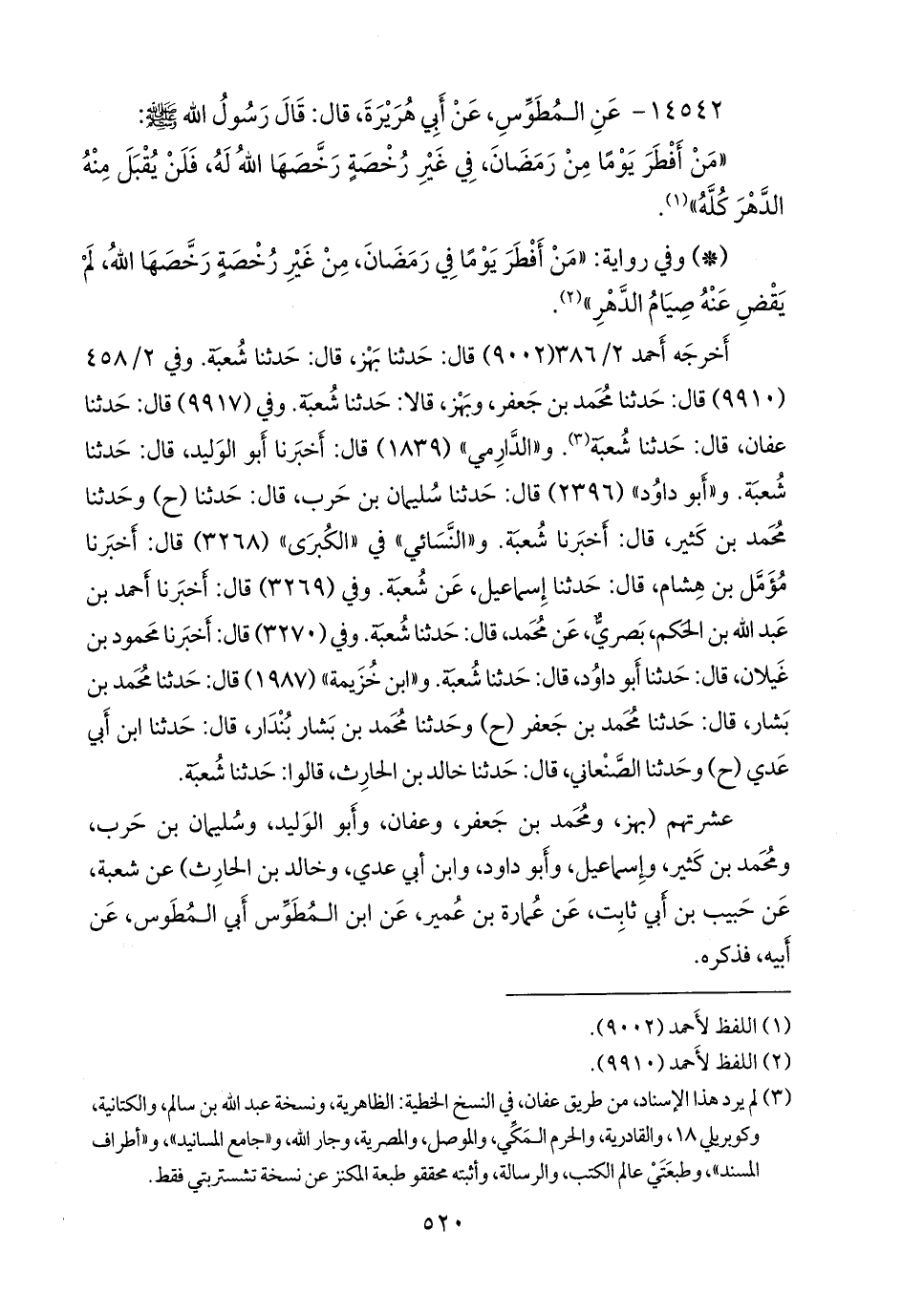 أخرجه أحمد (٩٠٠٢) قال: حدثنا بَهز، قال: حدثنا شعبة. وفي ٢/ ٤٥٨ (٩٩١٠) قال: حدثنا محمد بن جعفر، وبَهز، قالا: حدثنا شعبة. وفي (٩٩١٧) قال: حدثنا عفان، قال: حدثنا شعبة (¬٣). و «الدَّارِمي» (١٨٣٩) قال: أخبرنا أَبو الوليد، قال: حدثنا شعبة. و «أَبو داود» (٢٣٩٦) قال: حدثنا سليمان بن حرب، قال: حدثنا (ح) وحدثنا محمد بن كثير، قال: أخبرنا شعبة. و «النَّسَائي» في «الكبرى» (٣٢٦٨) قال: أخبرنا مُؤَمَّل بن هشام، قال: حدثنا إسماعيل، عن شعبة. وفي (٣٢٦٩) قال: أخبرنا أحمد بن عبد الله بن الحكم، بصري، عن محمد، قال: حدثنا شعبة. وفي (٣٢٧٠) قال: أخبرنا محمود بن غَيلان، قال: حدثنا أَبو داود، قال: حدثنا شعبة. و «ابن خزيمة» (١٩٨٧) قال: حدثنا محمد بن بشار، قال: حدثنا محمد بن جعفر (ح) وحدثنا محمد بن بشار بُندَار، قال: حدثنا ابن أَبي عَدي (ح) وحدثنا الصَّنْعاني، قال: حدثنا خالد بن الحارث، قالوا: حدثنا شعبة.