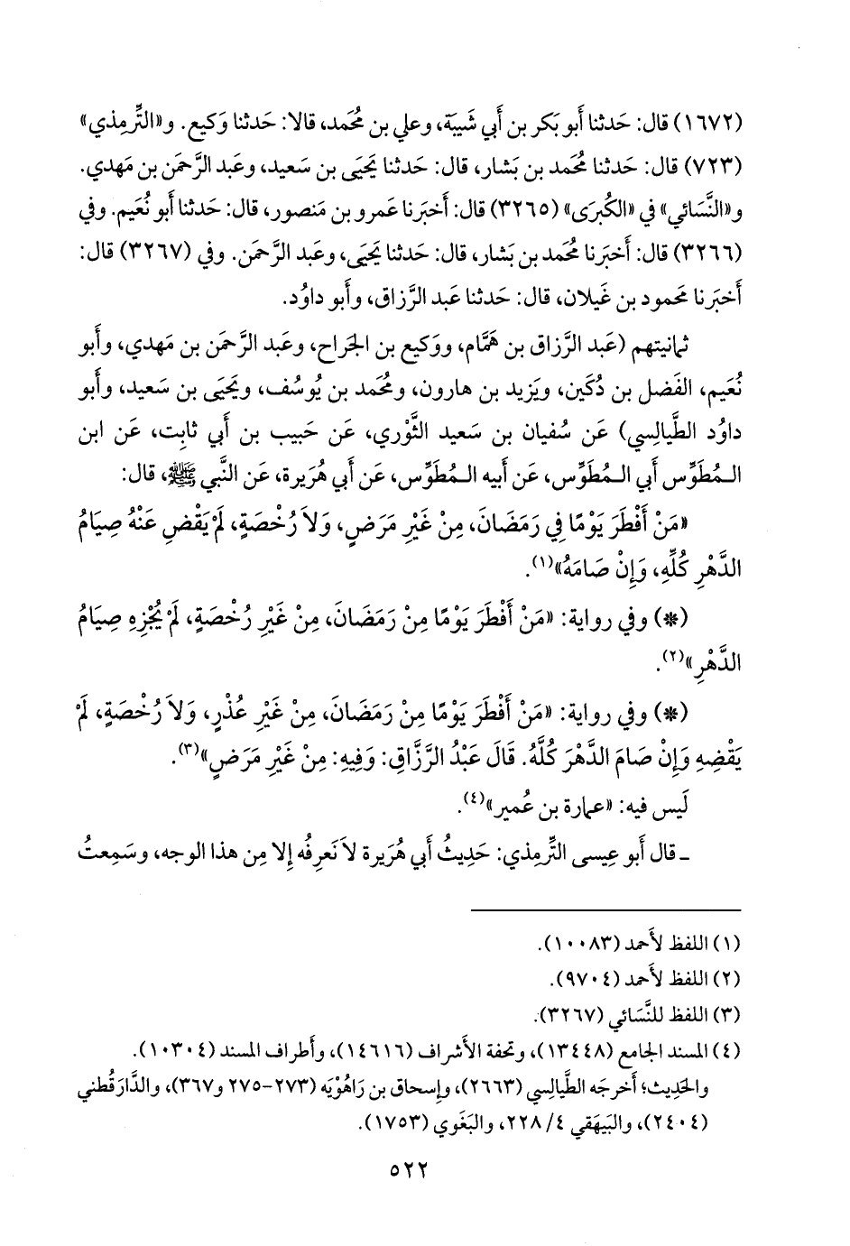 - وفي رواية: «من أفطر يوما من رمضان، من غير عذر، ولا رخصة، لم يقضه وإن صام الدهر كله. قال عبد الرزاق: وفيه: من غير مرض» (¬٣).