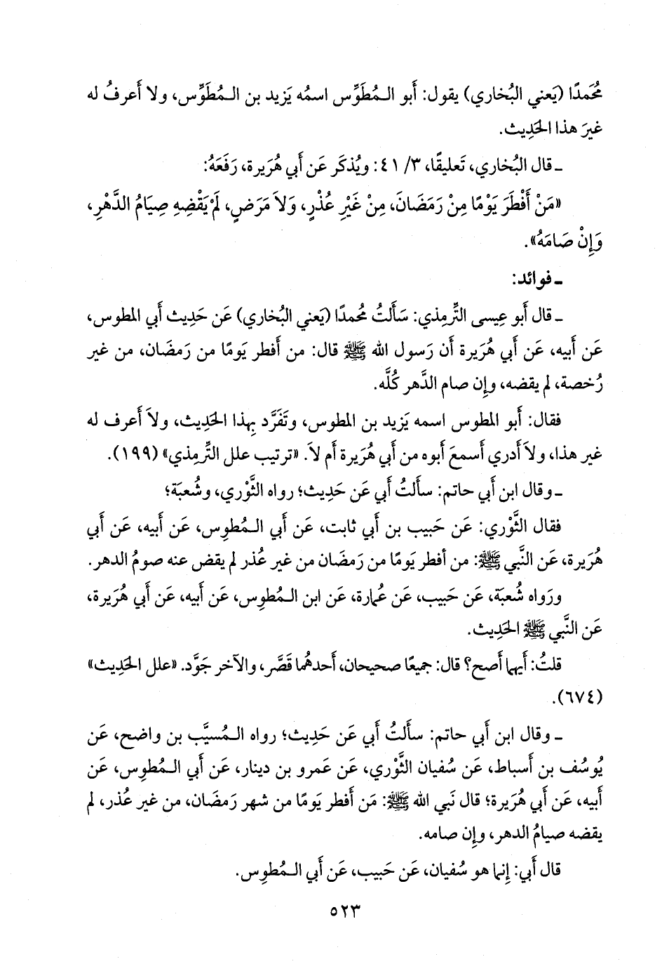 - قال التِّرمِذي: سألتُ محمدًا، يعني ابن إسماعيل البخاري، عن حديث أبي المطوس، عن أبيه، عن أبي هريرة أن رسول الله صَلى الله عَليه وسَلم قال: من أفطر يوما من رمضان، من غير رخصة، لم يقضه، وإن صام الدهر كله.