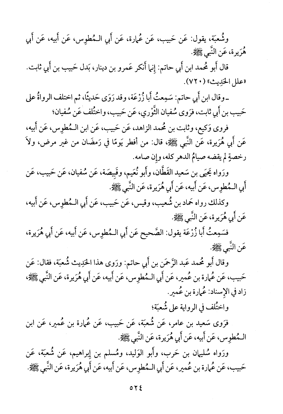وقال أَبو محمد عبد الرَّحمَن بن أبي حاتم: وروى هذا الحديث شعبة، فقال: عن حبيب، عن عمارة بن عمير، عن أبي المطوس، عن أبيه، عن أبي هريرة، عن النبي صَلى الله عَليه وسَلم زاد في الإسناد: عمارة بن عمير.
