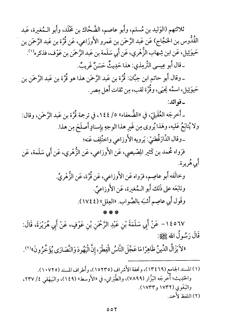 (¬٤) المسند الجامع (١٣٤٧٠)، وتحفة الأشراف (١٥٠٢٤ و ١٥٠٩٠ و ١٥١١٧)، وأطراف المسند (١٠٧٢٥).
