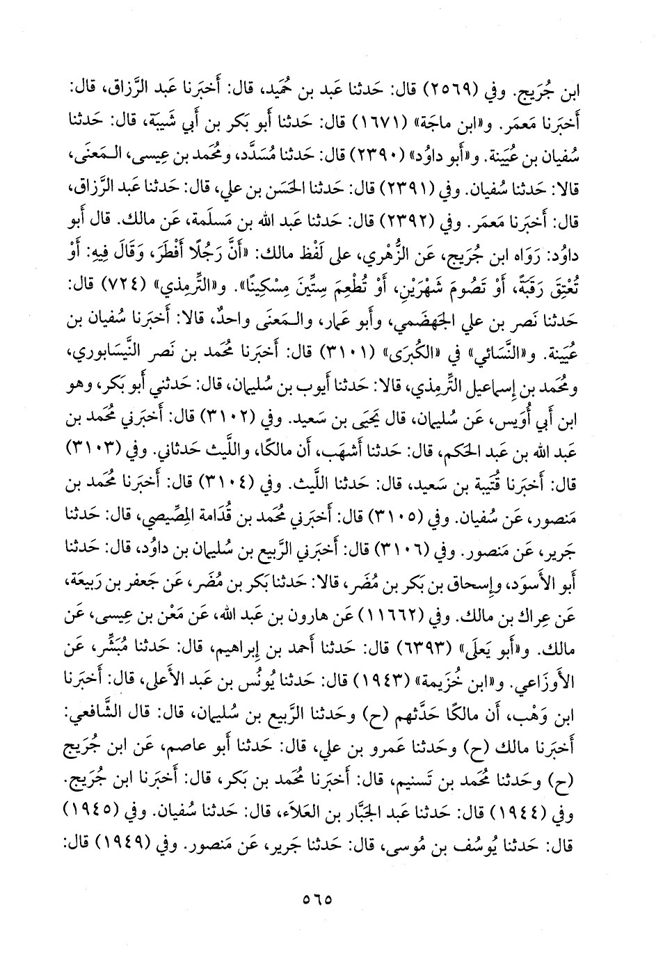 أخبرنا محمد بن عزيز الأيلي، أن سلامة حدثهم، عن عقيل. وفي (١٩٥٠) قال: حدثنا أَبو موسى، محمد بن المثنى، قال: حدثنا مُؤَمَّل، قال: حدثنا سفيان، قال: حدثنا منصور. و «ابن حِبَّان» (٣٥٢٣) قال: أخبرنا الحسين بن إدريس بن المبارك بن الهيثم الأَنصاري، قال: أخبرنا أحمد بن أَبي بكر، عن مالك. وفي (٣٥٢٤) قال: أخبرنا حامد بن محمد بن شعيب البلخي، ببغداد، قال: حدثنا سريج بن يونس، قال: حدثنا سفيان. وفي (٣٥٢٥) قال: أخبرنا الحسين بن محمد بن مصعب، قال: حدثنا محمد بن عبد الله بن عبد الحكم، قال: حدثنا إسحاق بن بكر بن مضر، عن أبيه، عن جعفر بن ربيعة، عن عراك بن مالك. وفي (٣٥٢٦ و ٣٥٢٧) قال: أخبرنا عبد الله بن محمد بن سَلم، قال: حدثنا عبد الرَّحمَن بن إبراهيم، قال: حدثنا الوليد بن مسلم، عن الأوزاعي. وفي (٣٥٢٩) قال: أخبرنا محمد بن عُبيد الله بن الفضل الكَلاعي، بحمص، قال: حدثنا عَمرو بن عثمان بن سعيد، قال: حدثنا أبي، قال: حدثنا شعيب بن أبي حمزة.