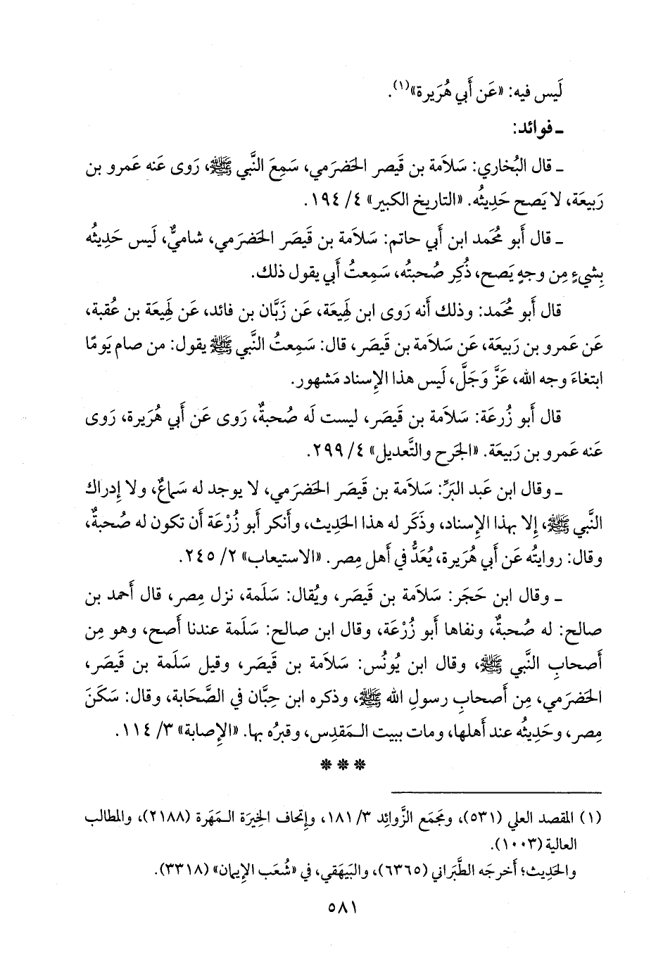 - وقال ابن عبد البَر: سلامة بن قيصر الحضرمي، لا يوجد له سماع، ولا إدراك النبي صَلى الله عَليه وسَلم إلا بهذا الإسناد، وذكر له هذا الحديث، وأنكر أَبو زُرعَة أن تكون له صحبة، وقال: روايته عن أبي هريرة، يعد في أهل مصر. «الاستيعاب» ٢/ ٢٤٥.