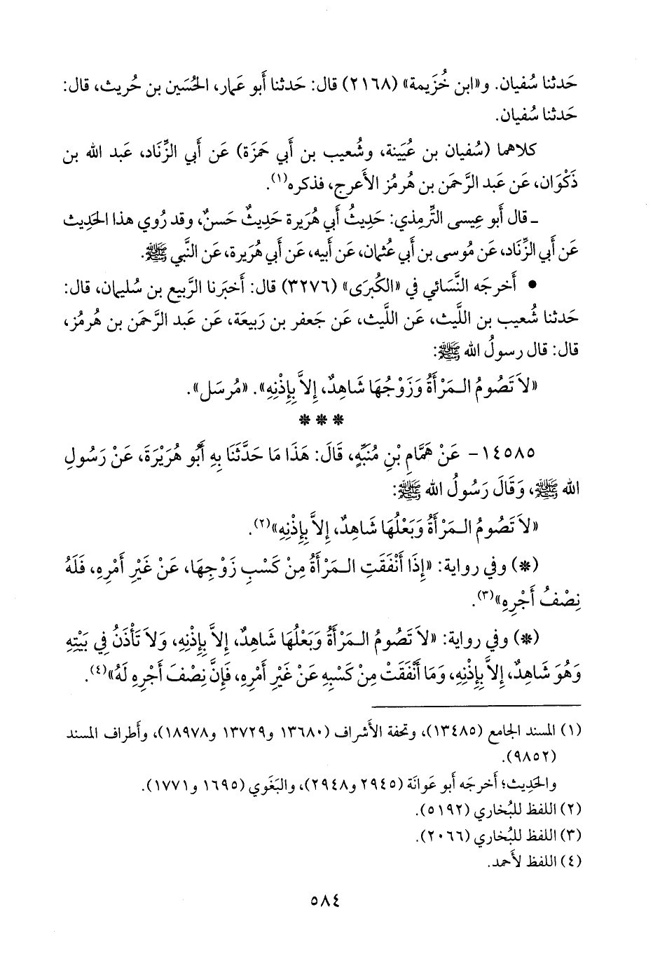 «لا تصوم المرأة وزوجها شاهد، إلا بإذنه». «مُرسَل».