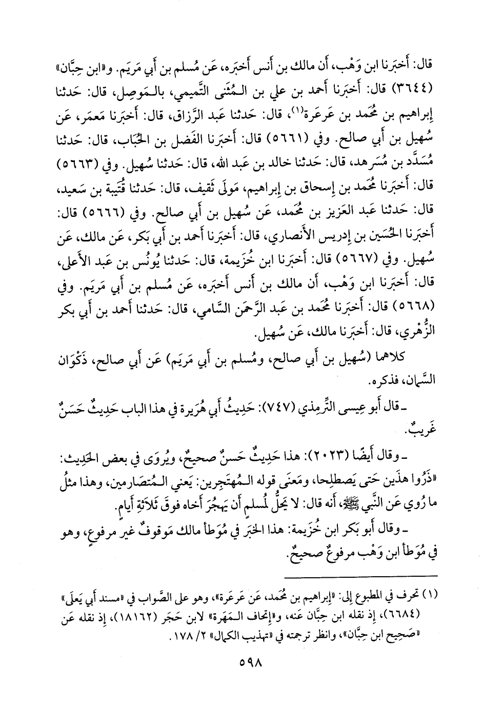 وفي (٥٦٦١) قال: أخبرنا الفضل بن الحُبَاب، قال: حدثنا مُسَدد بن مُسَرهد، قال: حدثنا خالد بن عبد الله، قال: حدثنا سهيل. وفي (٥٦٦٣) قال: أخبرنا محمد بن إسحاق بن إبراهيم مولى ثقيف، قال: حدثنا قتيبة بن سعيد، قال: حدثنا عبد العزيز بن محمد، عن سهيل بن أبي صالح. وفي (٥٦٦٦) قال: أخبرنا الحسين بن إدريس الأَنصاري، قال: أخبرنا أحمد بن أَبي بكر، عن مالك، عن سهيل. وفي (٥٦٦٧) قال: أخبرنا ابن خزيمة، قال: حدثنا يونس بن عبد الأعلى، قال: أخبرنا ابن وهب، أن مالك بن أَنس أخبره، عن مسلم بن أبي مريم. وفي (٥٦٦٨) قال: أخبرنا محمد بن عبد الرَّحمَن السامي، قال: حدثنا أحمد بن أَبي بكر الزُّهْري، قال: أخبرنا مالك، عن سهيل.