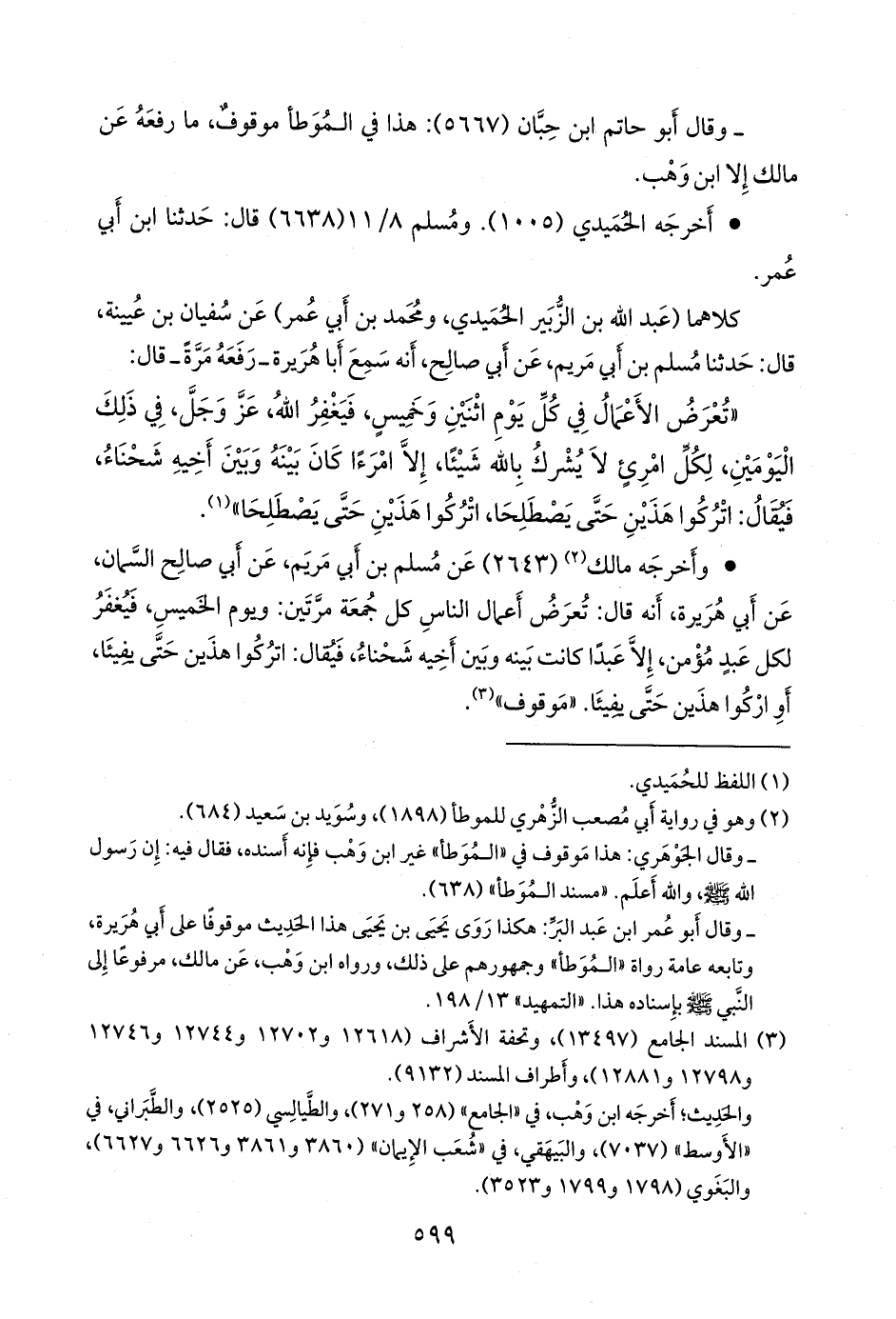 • وأخرجه مالك (¬٢) (٢٦٤٣) عن مسلم بن أبي مريم، عن أبي صالح السَّمَّان، عن أبي هريرة، أنه قال: تعرض أعمال الناس كل جمعة مرتين: ويوم الخميس، فيغفر لكل عبد مؤمن، إلا عبدًا كانت بينه وبين أخيه شحناء، فيقال: اتركوا هذين حتى يفيئا، أو اركوا هذين حتى يفيئا. «موقوف» (¬٣).