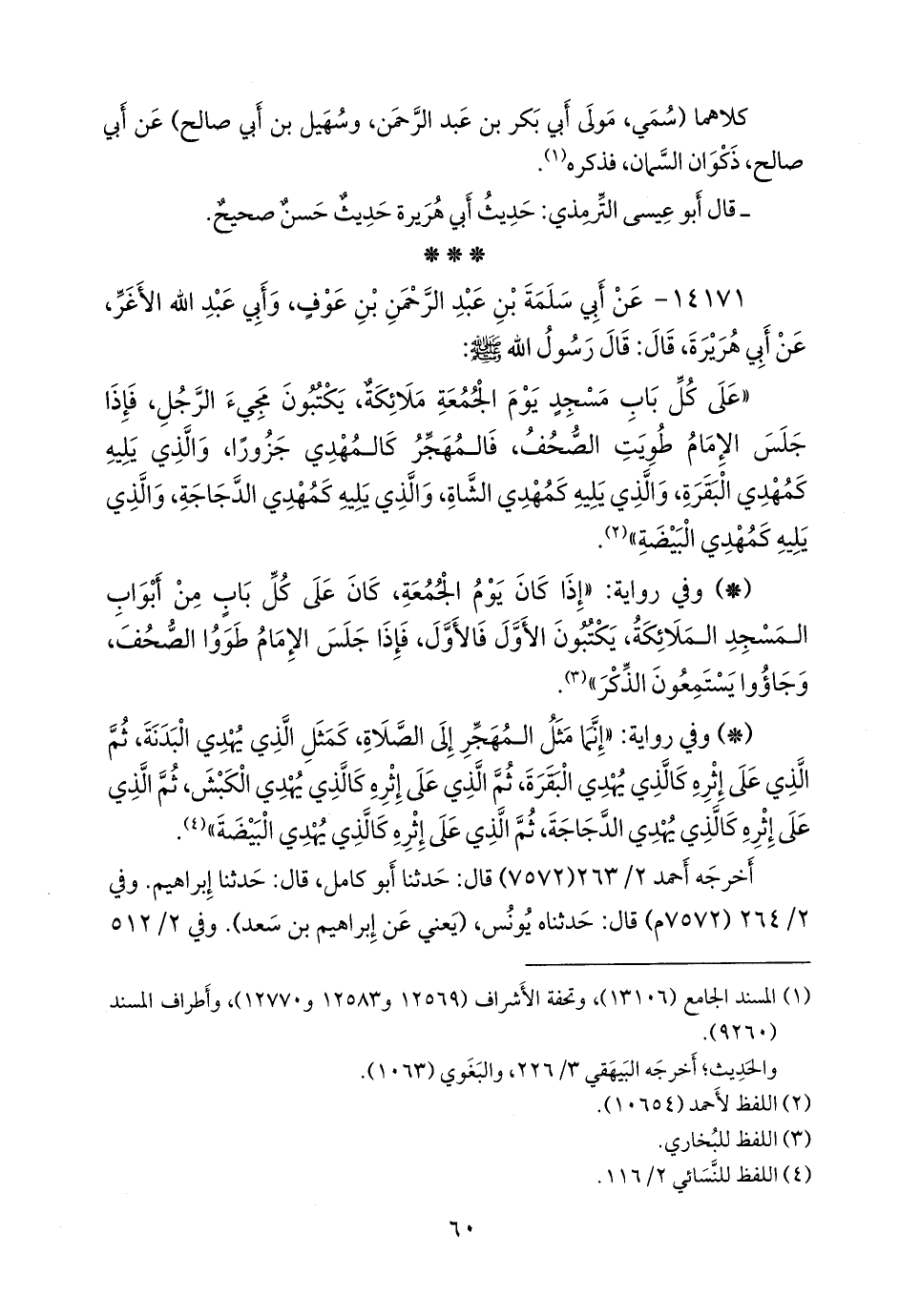 «على كل باب مسجد يوم الجمعة ملائكة، يكتبون مجيء الرجل، فإذا جلس الإمام طويت الصحف، فالمهجر كالمهدي جزورا، والذي يليه كمهدي البقرة، والذي يليه كمهدي الشاة، والذي يليه كمهدي الدجاجة، والذي يليه كمهدي البيضة» (¬١).