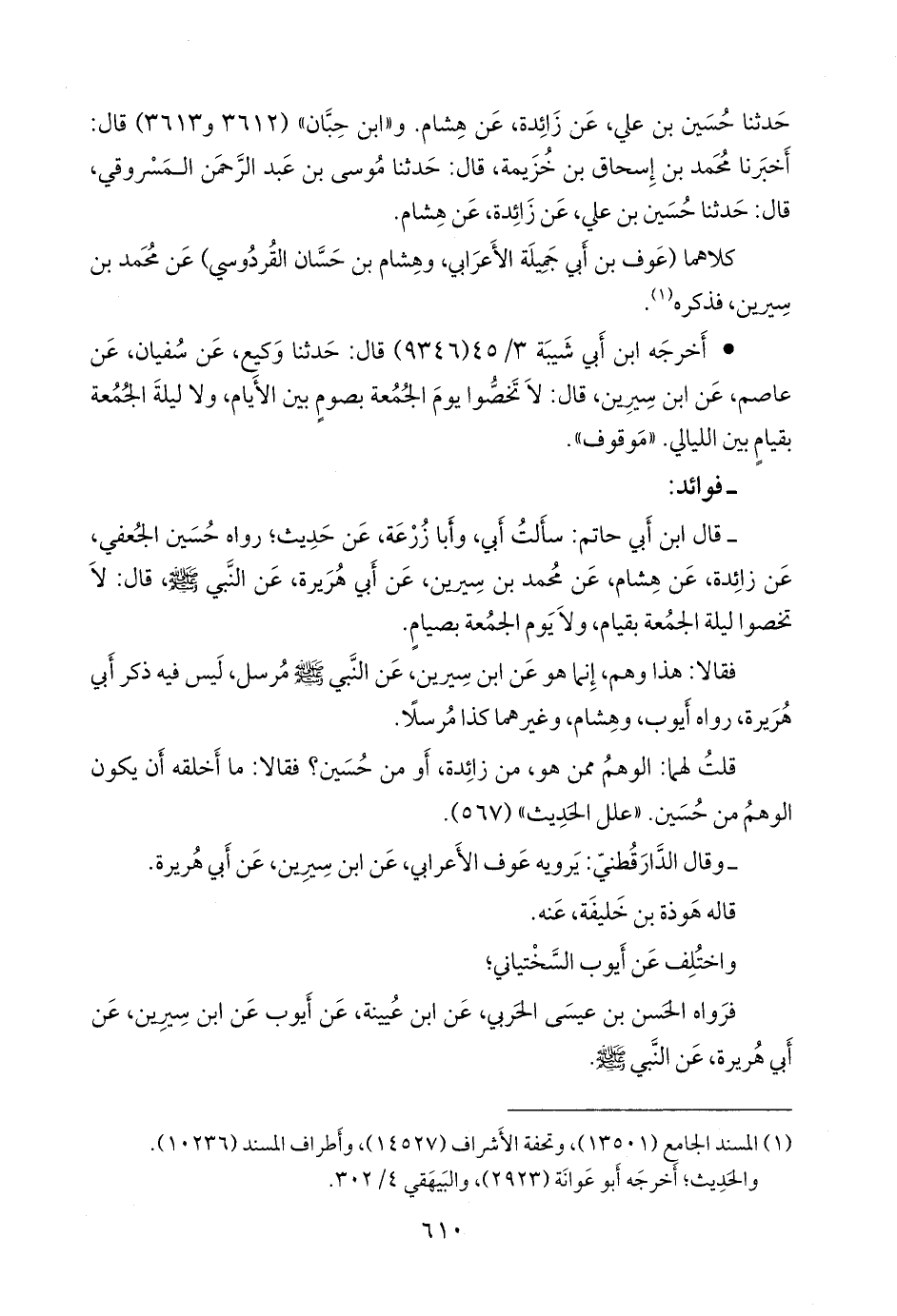 - قال عبد الرَّحمَن بن أبي حاتم الرازي: سألت أبي، وأَبا زُرعَة، عن حديث؛ رواه حسين الجعفي، عن زائدة، عن هشام، عن محمد بن سِيرين، عن أبي هريرة، عن النبي صَلى الله عَليه وسَلم قال: لا تخصوا ليلة الجمعة بقيام، ولا يوم الجمعة بصيام.
