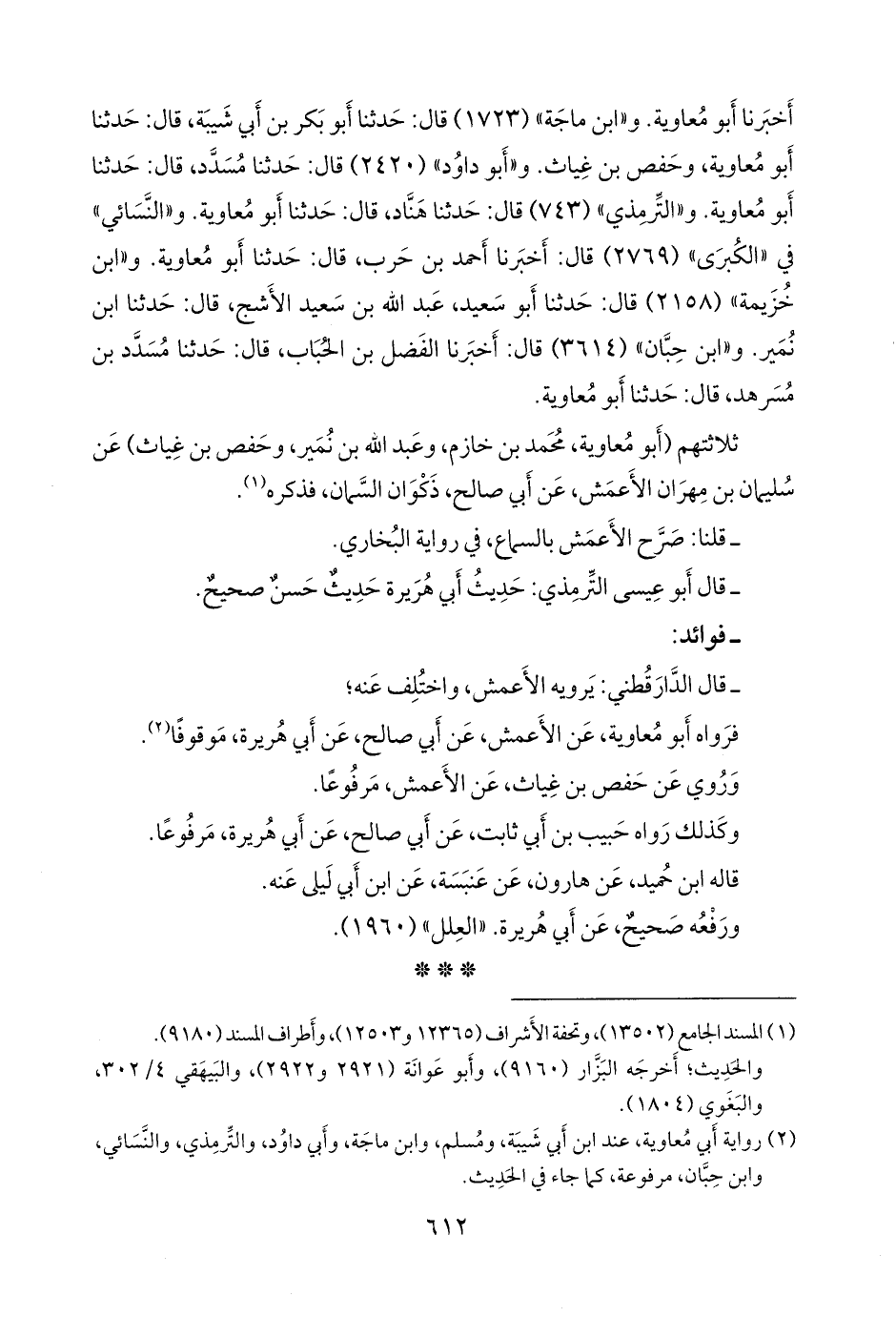 ثلاثتهم (أَبو معاوية محمد بن خازم، وعبد الله بن نُمير، وحفص بن غياث) عن سليمان بن مِهران الأعمش، عن أبي صالح، ذكوان السمان، فذكره (¬١).