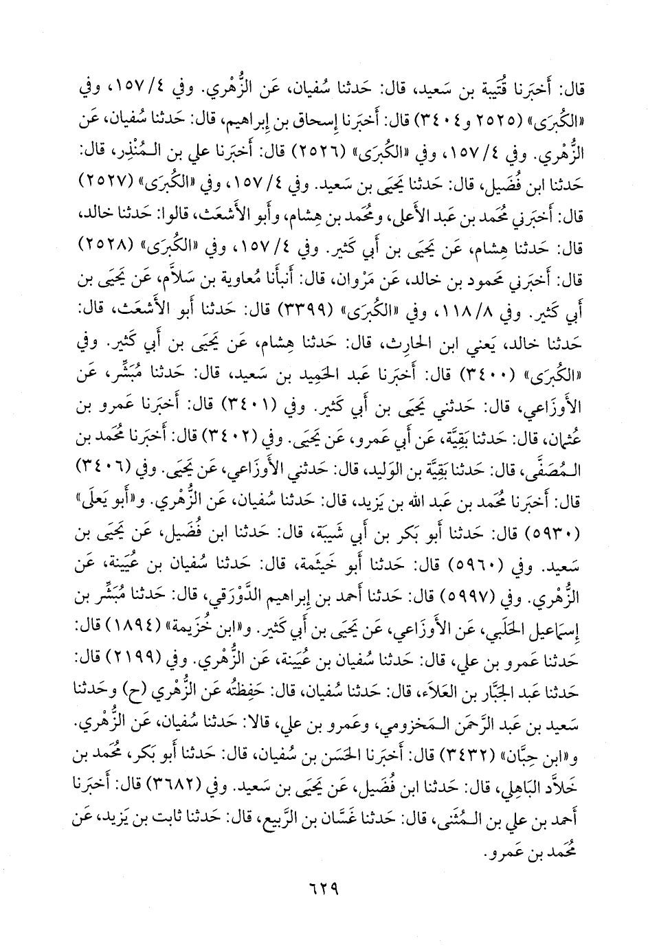 وفي (٥٩٦٠) قال: حدثنا أَبو خيثمة، قال: حدثنا سفيان بن عُيينة، عن الزُّهْري. وفي (٥٩٩٧) قال: حدثنا أحمد بن إبراهيم الدورقي، قال: حدثنا مبشر بن إسماعيل الحلبي، عن الأوزاعي، عن يحيى بن أبي كثير. و «ابن خزيمة» (١٨٩٤) قال: حدثنا عَمرو بن علي، قال: حدثنا سفيان بن عُيينة، عن الزُّهْري. وفي (٢١٩٩) قال: حدثنا عبد الجبار بن العلاء، قال: حدثنا سفيان، قال: حفظته عن الزُّهْري (ح) وحدثنا سعيد بن عبد الرَّحمَن المخزومي، وعَمرو بن علي، قالا: حدثنا سفيان، عن الزُّهْري. و «ابن حِبَّان» (٣٤٣٢) قال: أخبرنا الحسن بن سفيان، قال: حدثنا أَبو بكر، محمد بن خلاد الباهلي، قال: حدثنا ابن فضيل، عن يحيى بن سعيد. وفي (٣٦٨٢) قال: أخبرنا أحمد بن علي بن المثنى، قال: حدثنا غسان بن الربيع، قال: حدثنا ثابت بن يزيد، عن محمد بن عَمرو.