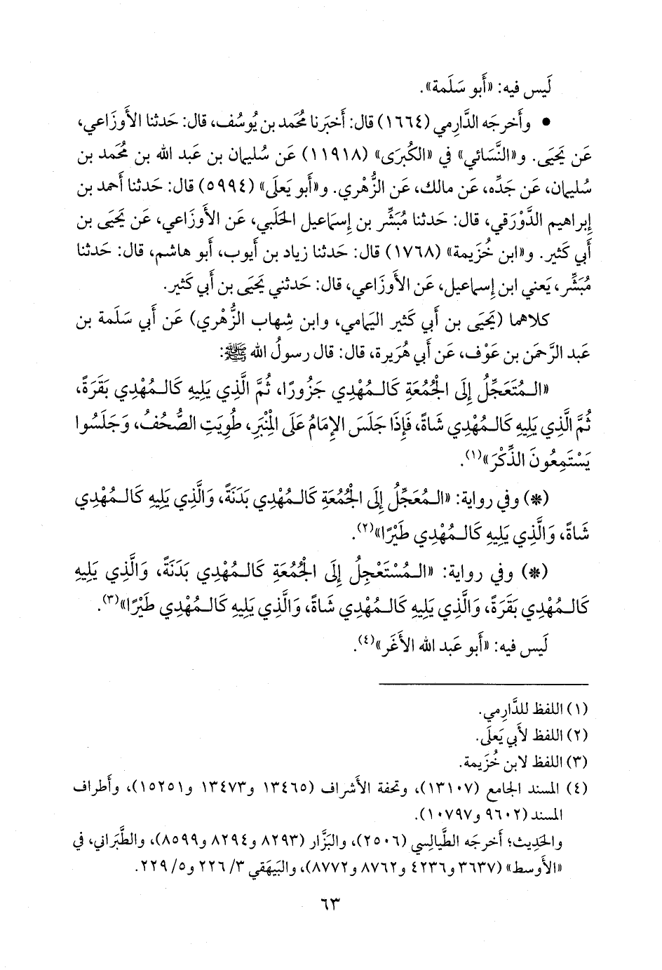 - وفي رواية: «المستعجل إلى الجمعة كالمهدي بدنة، والذي يليه كالمهدي بقرة، والذي يليه كالمهدي شاة، والذي يليه كالمهدي طيرا» (¬٣).