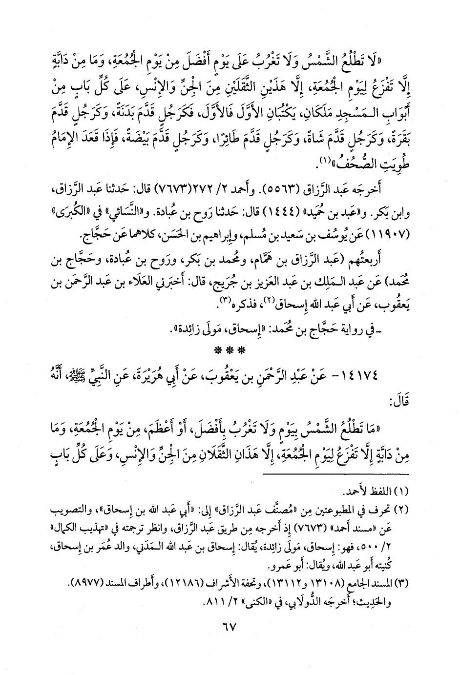 - وفي رواية: «لا تطلع الشمس، ولا تغرب على يوم أفضل من يوم الجمعة، وما من دابة إلا وهي تفزع يوم الجمعة، إلا هذين الثقلين: الجن، والإنس» (¬٣).