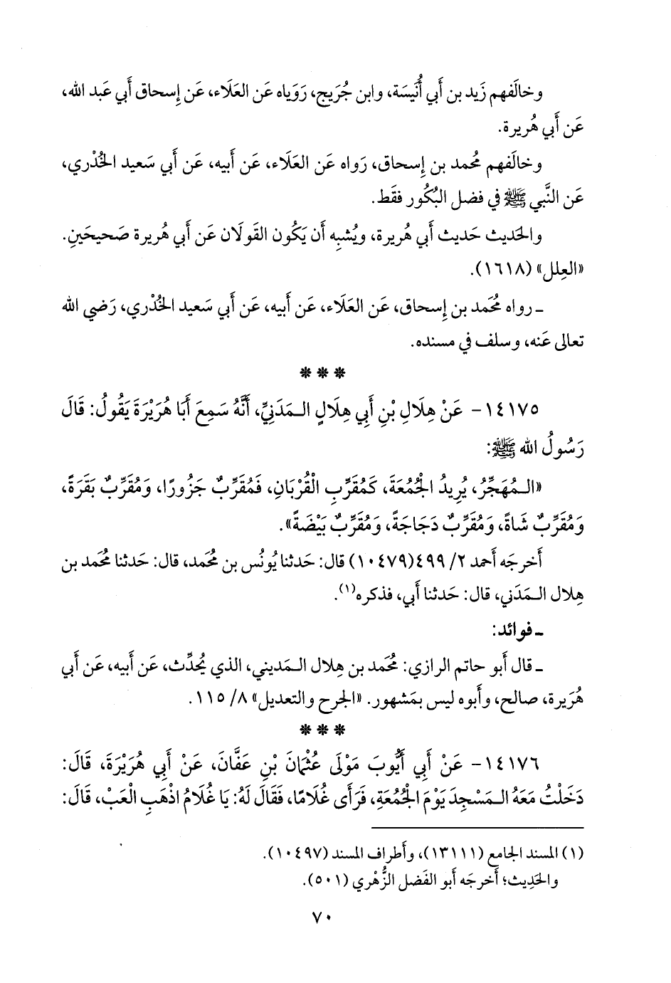 - قلنا: إِسناده ضعيفٌ؛ قال أَبو حاتم الرازي: محمد بن هلال المديني، الذي يحدث، عن أبيه، عن أبي هريرة، صالح، وأَبوه ليس بمشهور. «الجرح والتعديل» ٨/ ١١٥.
