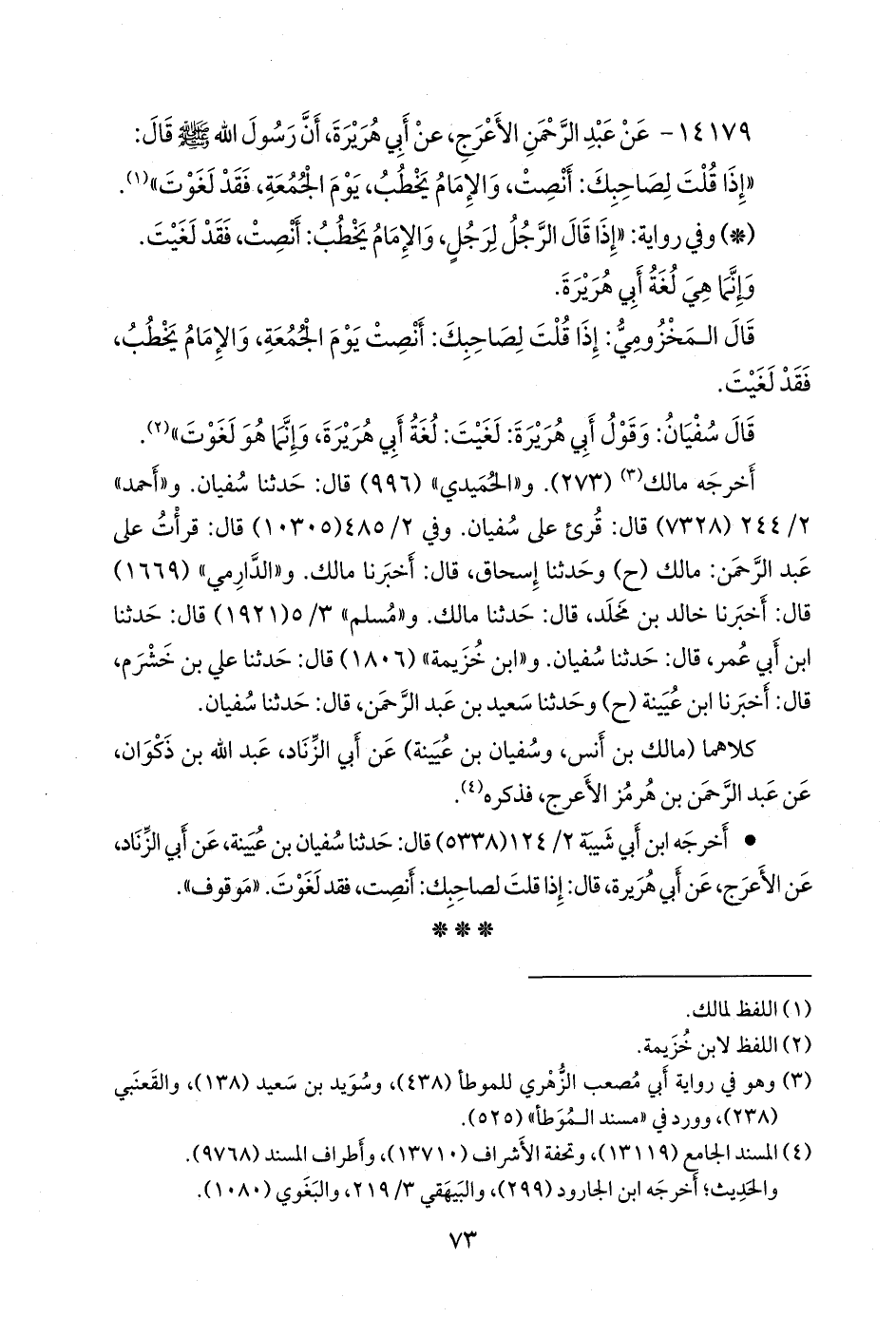 • أَخرجه ابن أبي شيبة (٥٣٣٨) قال: حدثنا سفيان بن عُيينة، عن أبي الزناد، عن الأعرج، عن أبي هريرة، قال: إذا قلت لصاحبك: أنصت، فقد لغوت. «موقوف».