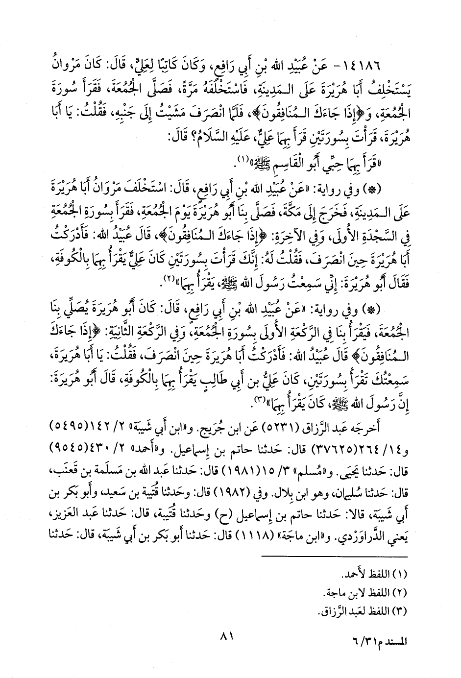 ١٤١٨٦ - عن عُبيد الله بن أبي رافع، وكان كاتبا لعلي، قال: كان مروان يستخلف أبا هريرة على المدينة، فاستخلفه مرة، فصلى الجمعة، فقرأ سورة الجمعة، و {إذا جاءك المنافقون}، فلما انصرف مشيت إلى جنبه، فقلت: يا أبا هريرة، قرأتَ بسورتين قرأ بهما علي، عليه السلام؟ قال: