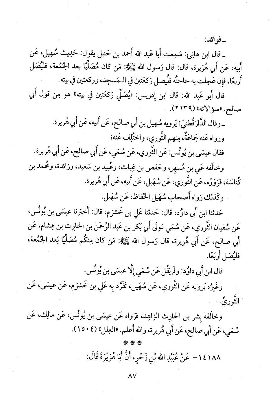 - قال ابن هانئ: سمعت أبا عبد الله أحمد بن حنبل يقول: حديث سهيل، عن أبيه، عن أبي هريرة، قال: قال رسول الله صَلى الله عَليه وسَلم: من كان مصليا بعد الجمعة، فليصل أربعا، فإن عجلت به حاجته فليصل ركعتين في المسجد، وركعتين في بيته.