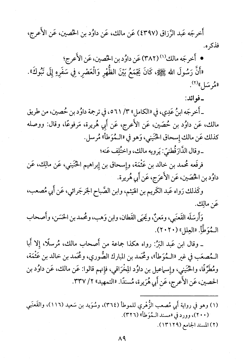 - وقال ابن عبد البَر: هكذا حدثنا به في «الموطأ» أَبو مصعب، عنه، مرسل، وكذلك هو عنه في «الموطأ» مرسل، وذكر أحمد بن خالد، أن يحيى بن يحيى روى هذا الحديث عن مالك، عن داود بن الحُصين، عن الأعرج، عن أبي هريرة؛ أن رسول الله صَلى الله عَليه وسَلم كان يجمع بين الظهر والعصر في سفره إلى تبوك، مسندا، قال: وأصحاب مالك جميعا على إرساله. «التمهيد» ٢/ ٣٣٨.