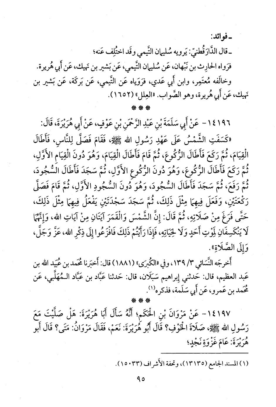 ١٤١٩٧ - عن مروان بن الحكم؛ أنه سأل أبا هريرة: هل صليت مع رسول الله صَلى الله عَليه وسَلم صلاة الخوف؟ قال أَبو هريرة: نعم، فقال مروان: متى؟ قال أَبو هريرة: عام غزوة نجد؛