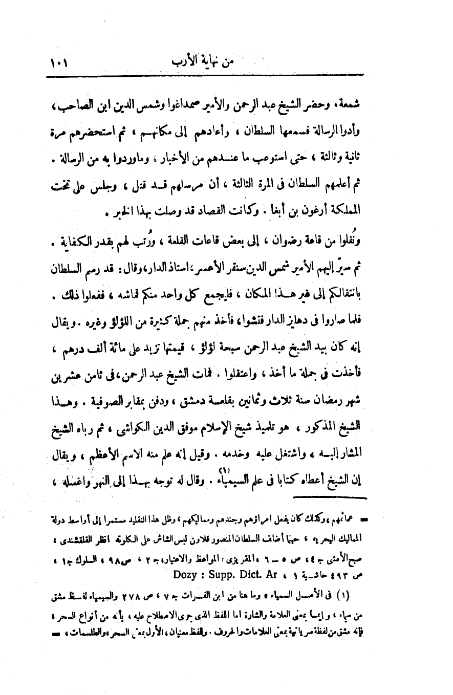 فلما صاروا فى دهليز الدار فتشوا، فأخذ منهم جملة كثيرة من اللؤلؤ وغيره. ويقال إنه كان بيد الشيخ عبد الرحمن سبحة لؤلؤ، قيمتها تزيد على مائة ألف درهم، فأخذت فى جملة ما أخذ، واعتقلوا. فمات الشيخ عبد الرحمن، فى ثامن عشرين شهر رمضان سنة ثلاث وثمانين بقلعة دمشق، ودفن بمقابر الصوفية. وهذا الشيخ المذكور، هو تلميذ شيخ الإسلام موفق الدين الكواشى، ثم رباه الشيخ المشار إليه، واشتغل عليه وخدمه. وقيل إنه علم منه الاسم الأعظم، ويقال إن الشيخ أعطاه كتابا فى علم السيمياء «1» . وقال له توجه بهذا إلى النهر واغسله،