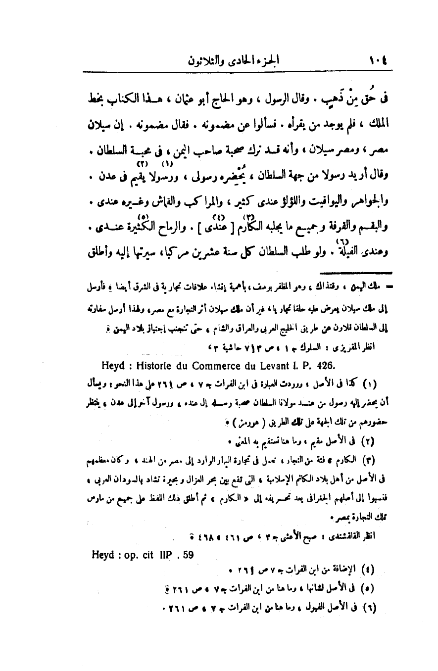 فى حق من ذهب. وقال الرسول، وهو الحاج أبو عثمان، هذا الكتاب بخط الملك، فلم يوجد من يقرأه. فسألوا عن مضمونه. فقال مضمونه. إن سيلان مصر، ومصر سيلان، وأنه قد ترك صحبة صاحب اليمن، فى محبة السلطان.