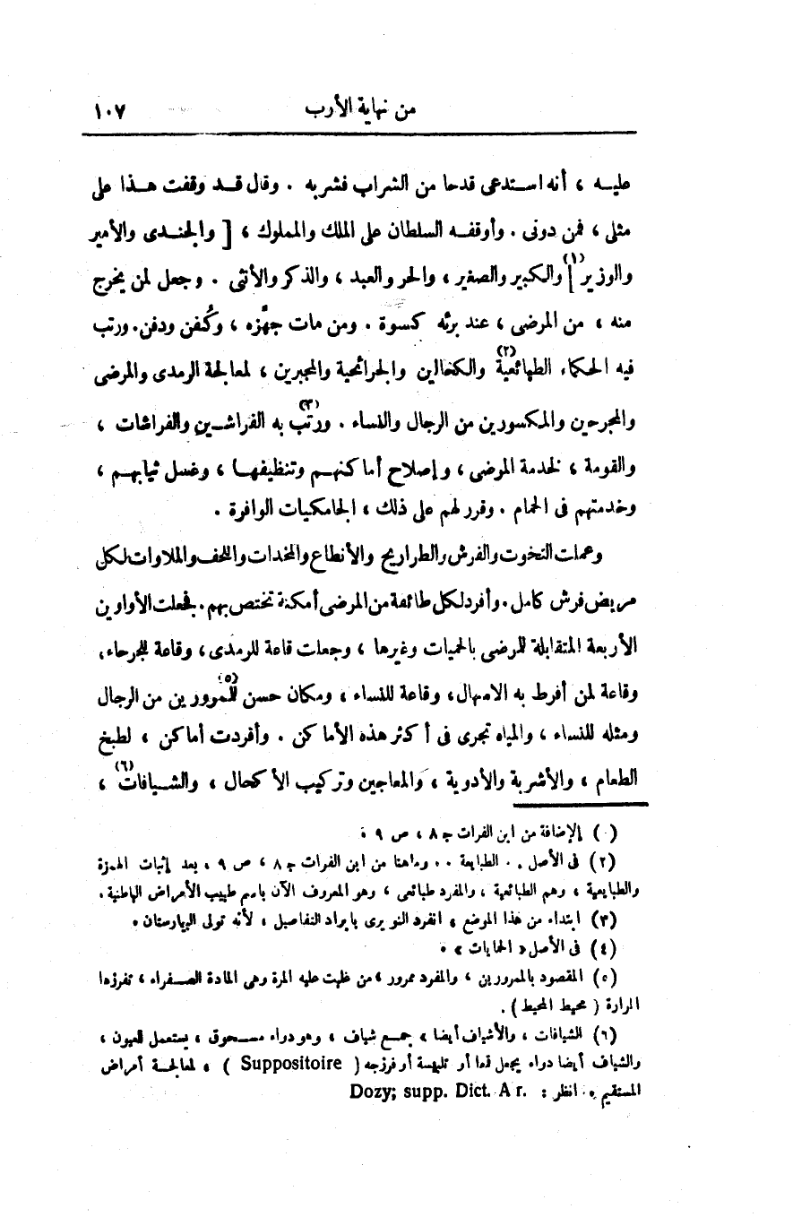 وعملت النخوت والفرش والطراريح والأنطاع والمخدات واللحف والملاوات لكل مريض فرش كامل. وأفرد لكل طائفة من المرضى أمكنة تختص بهم. فجعلت الأواوين الأربعة المتقابلة للمرضى بالحميات «4» وغيرها، وجعلت قاعة للرمدى، وقاعة للجرحاء، وقاعة لمن أفرط به الاصهال، وقاعة للنساء، ومكان حسن للمرورين «5» من الرجال ومثله للنساء، والمياه تجرى فى أكثر هذه الأماكن. وأفردت أماكن. لطبخ الطعام، والأشربة والأدوية، والمعاجين وتركيب الأكحال، والشيافات «6» ،