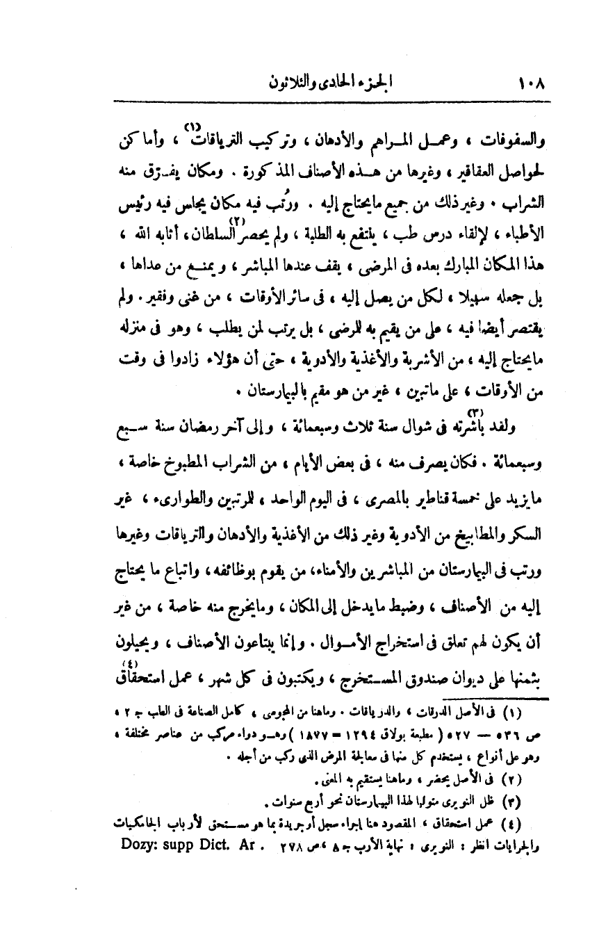 ولقد باشرته «3» فى شوال سنة ثلاث وسبعمائة، وإلى آخر رمضان سنة سبع وسبعمائة. فكان يصرف منه، فى بعض الأيام، من الشراب المطبوخ خاصة، ما يزيد على خمسة قناطير بالمصرى، فى اليوم الواحد، للمرتبين والطوارى، غير السكر والمطابيخ من الأدوية وغير ذلك من الأغذية والأدهان والترياقات وغيرها ورتب فى البيمارستان من المباشرين والأمناء، من يقوم بوظائفه، واتباع ما يحتاج إليه من الأصناف، وضبط ما يدخل إلى المكان، وما يخرج منه خاصة، من غير أن يكون لهم تعلق فى استخراج الأموال. وإنما يبتاعون الأصناف، ويحيلون بثمنها على ديوان صندوق المستخرج، ويكتبون فى كل شهر، عمل استحقاق «4»