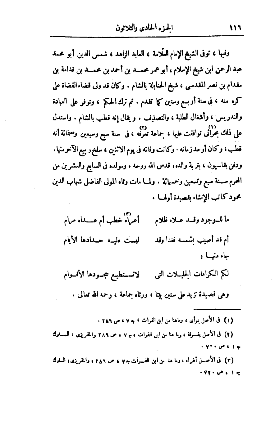 وفيها، توفى الشيخ الإمام العّلامة، العابد الزاهد، شمس الدين أبو محمد عبد الرحمن ابن شيخ الإسلام، أبو عمر محمد بن أحمد بن محمد بن قدامة بن مقدام بن نصر المقدسى، شيخ الحنابلة بالشام. وكان قد ولى قضاء القضاة على كره منه، فى سنة أربع وستين كما تقدم. ثم ترك الحكم، وتوفر على العبادة والتدريس، وأشغال الطلبة، والتصنيف. ويقال إنه قطب بالشام. واستدل على ذلك بحرائى «1» توافقت عليها، جماعة تعرفه «2» ، فى سنة سبع وسبعين وستمائة أنه قطب، وكان أوحد زمانه. وكانت وفاته فى يوم الاثنين، سلخ ربيع الآخر منها.