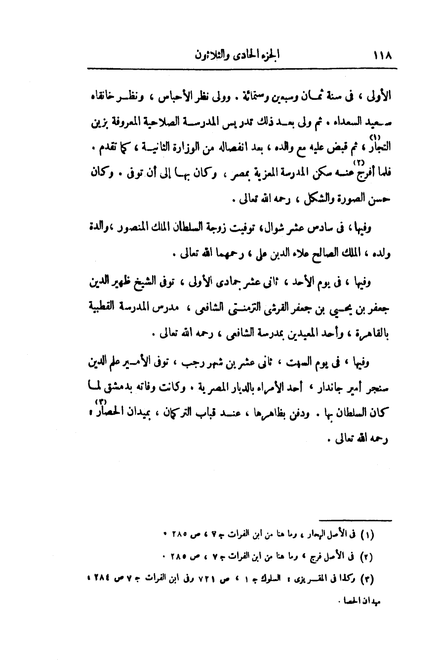 وفيها، فى يوم السبت، ثانى عشرين شهر رجب، توفى الأمير علم الدين سنجر أمير جاندار، أحد الأمراء بالديار المصرية. وكانت وفاته بدمشق لما كان السلطان بها. ودفن بظاهرها، عند قباب التركمان، بميدان الحصار «3» :