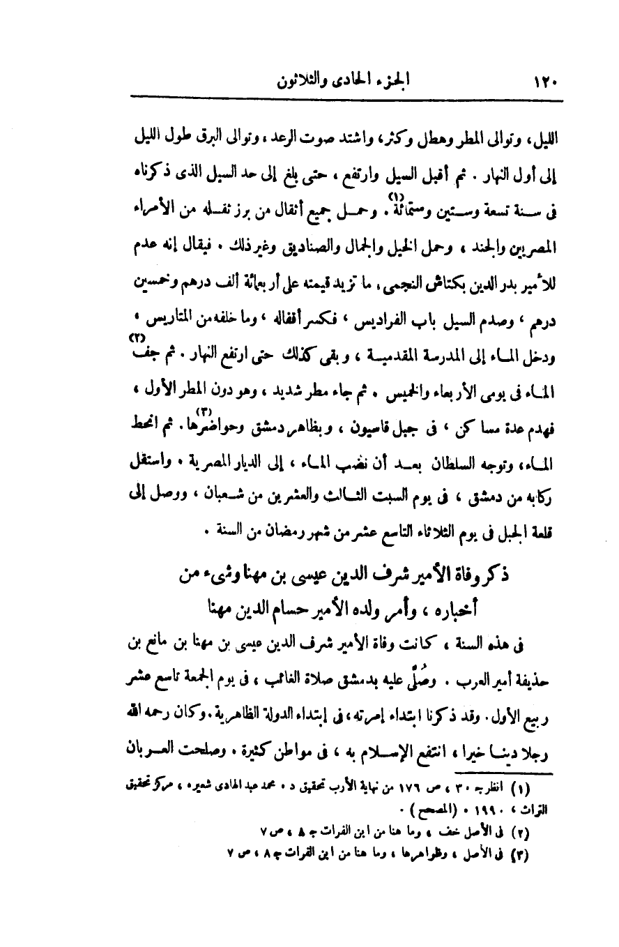الليل، وتوالى المطر وهطل وكثر، واشتد صوت الرعد، وتوالى البرق طول الليل إلى أول النهار. ثم أقبل السيل وارتفع، حتى بلغ إلى حد السبل الذى ذكرناه فى سنة تسعة وستين وستمائة «1» . وحمل جميع أثقال من برز ثقله من الأمراء المصريين والجند، وحمل الخيل والجمال والصناديق وغير ذلك. فيقال إنه عدم للأمير بدر الدين بكتاش النجمى، ما تزيد قيمته على أربعمائة ألف درهم وخمسين درهم، وصدم السيل باب الفراديس، فكسر أقفاله، وما خلفه من المتاريس، ودخل الماء إلى المدرسة المقدمية، وبقى كذلك حتى ارتفع النهار. ثم جف «2» الماء فى يومى الأربعاء والخميس. ثم جاء مطر شديد، وهو دون المطر الأول، فهدم عدة مساكن، فى جبل قاسيون، وبظاهر دمشق وحواضرها «3» . ثم انحط الماء، وتوجه السلطان بعد أن نضب الماء، إلى الديار المصرية، واستقل ركابه من دمشق، فى يوم السبت الثالث والعشرين من شعبان، ووصل إلى قلعة الجبل فى يوم الثلاثاء التاسع عشر من شهر رمضان من السنة.