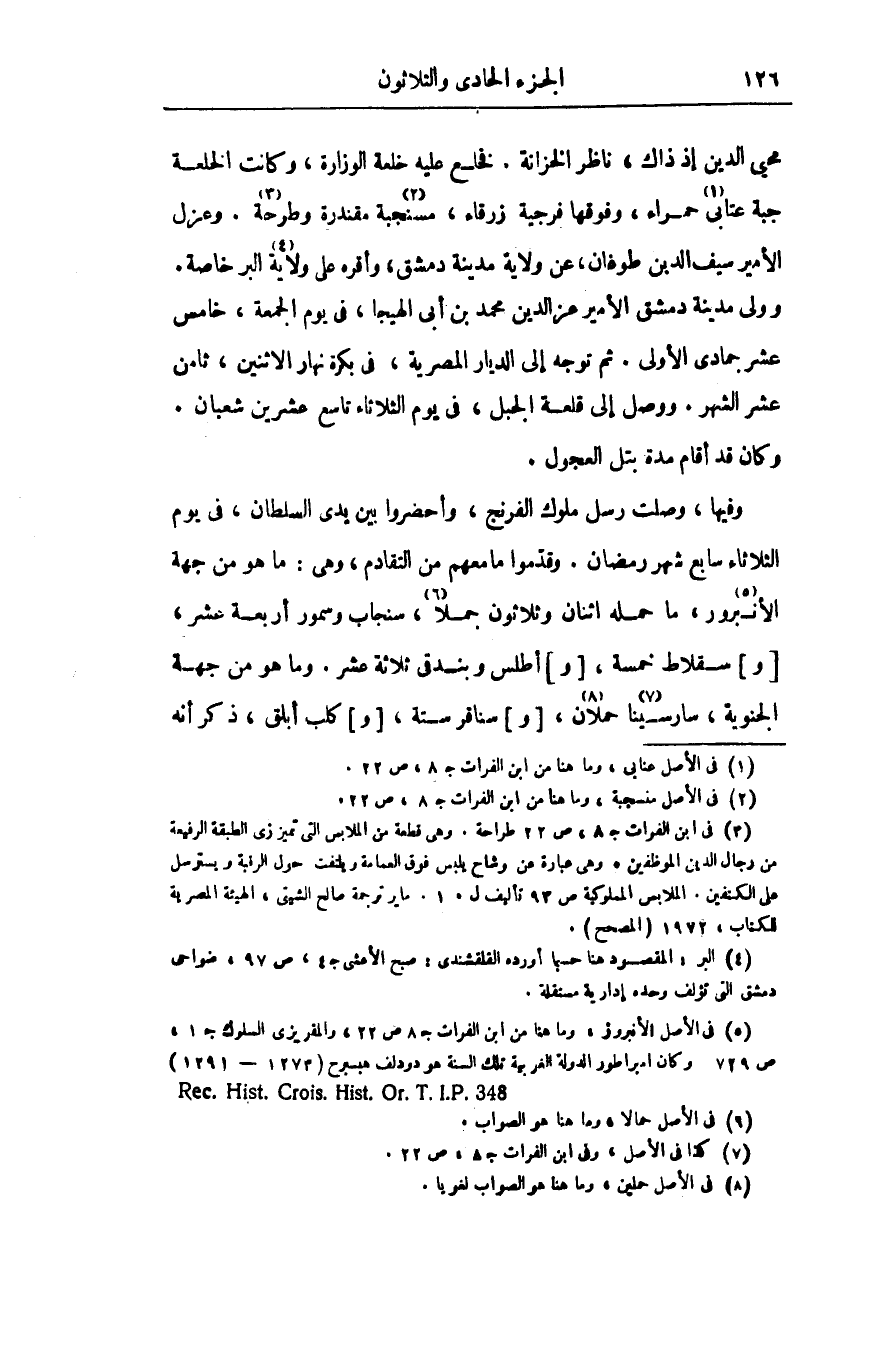 وفيها، وصلت رسل ملوك الفرنج، وأحضروا بين يدى السلطان، فى يوم الثلاثاء سابع شهر رمضان. وقدّموا ما معهم من التقادم، وهى: ما هو من جهة الأنبرور «5» ، ما حمله اثنان وثلاثون جملا «6» ، سنجاب وسمور أربعة عشر، [و] سقلاط خمسة، [و] أطلس وبندقى ثلاثة عشر. وما هو من جهة الجنوية، سار سينا «7» حملان «8» ، [و] سناقر ستة، [و] كلب أبلق، ذكر أنه