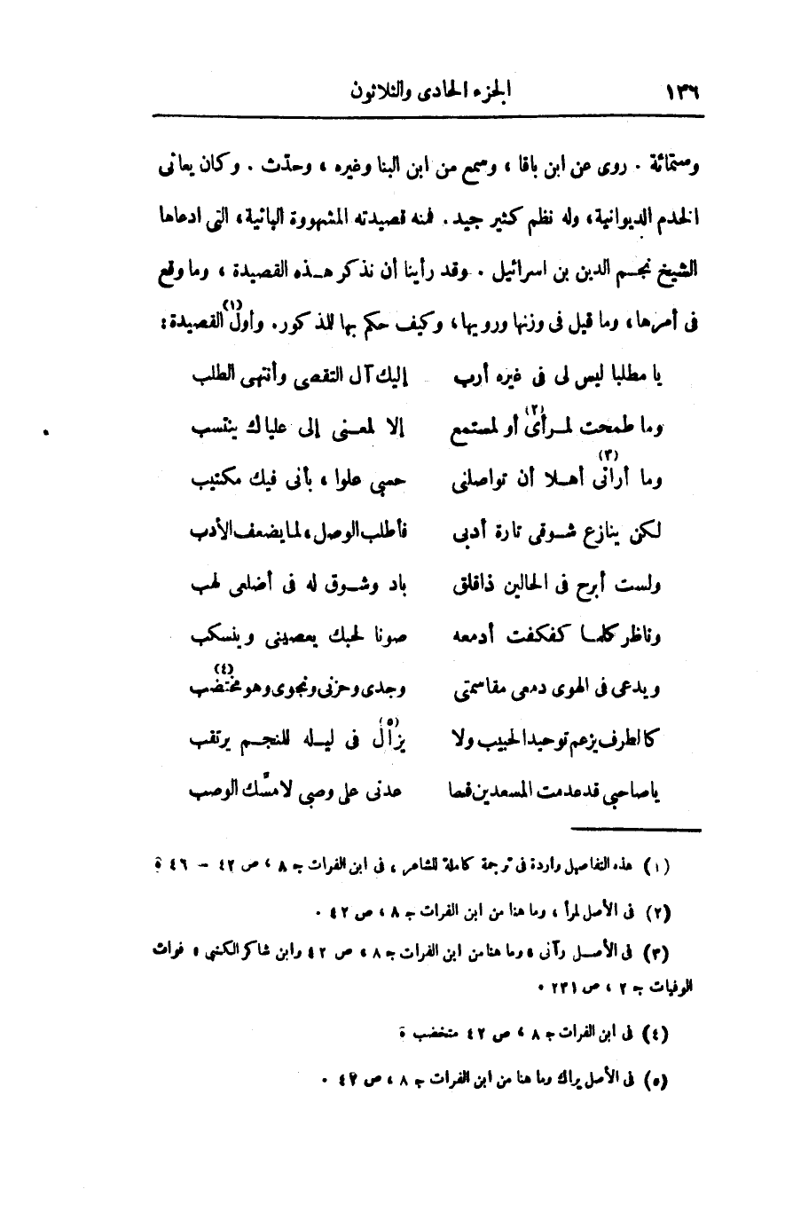 وستمائة. روى عن ابن باقا، وسمع من ابن البنا وغيره، وحدّث. وكان يعانى الخدم الديوانية، وله نظم كثير جيد. فمنه قصيدته المشهورة البائية، التى ادعاها الشيخ نجم الدين بن اسرائيل. وقد رأينا أن نذكر هذه القصيدة، وما وقع فى أمرها، وما قيل فى وزنها ورويها، وكيف حكم بها للمذكور. وأول «1» القصيدة: