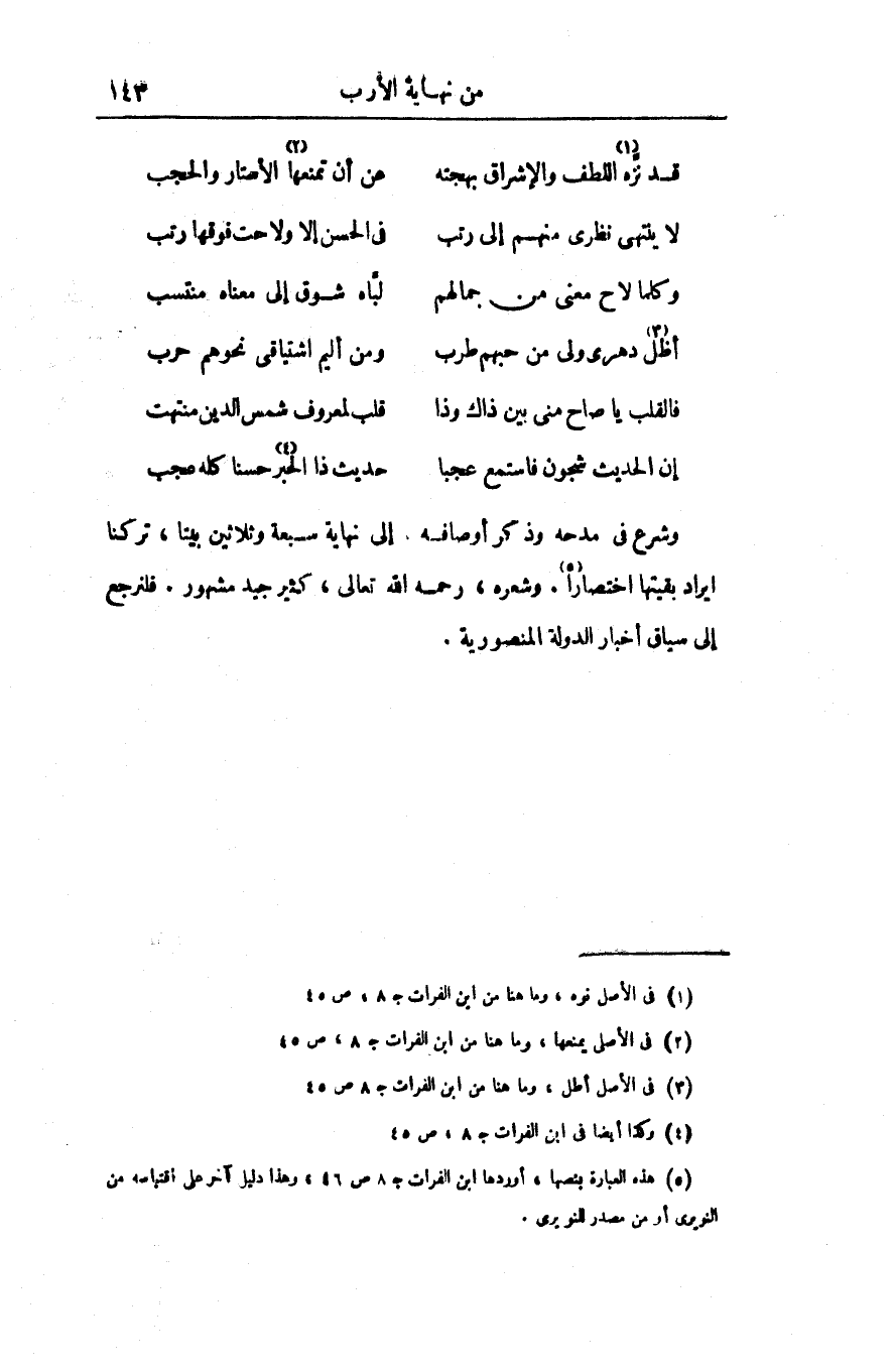 وشرع فى مدحه وذكر أوصافه. إلى نهاية سبعة وثلاثين بيتا، تركنا ايراد بقيتها اختصارا «5» . وشعره، رحمه الله تعالى، كثير جيد مشهور. فلنرجع إلى سياق أخبار الدولة المنصورية.