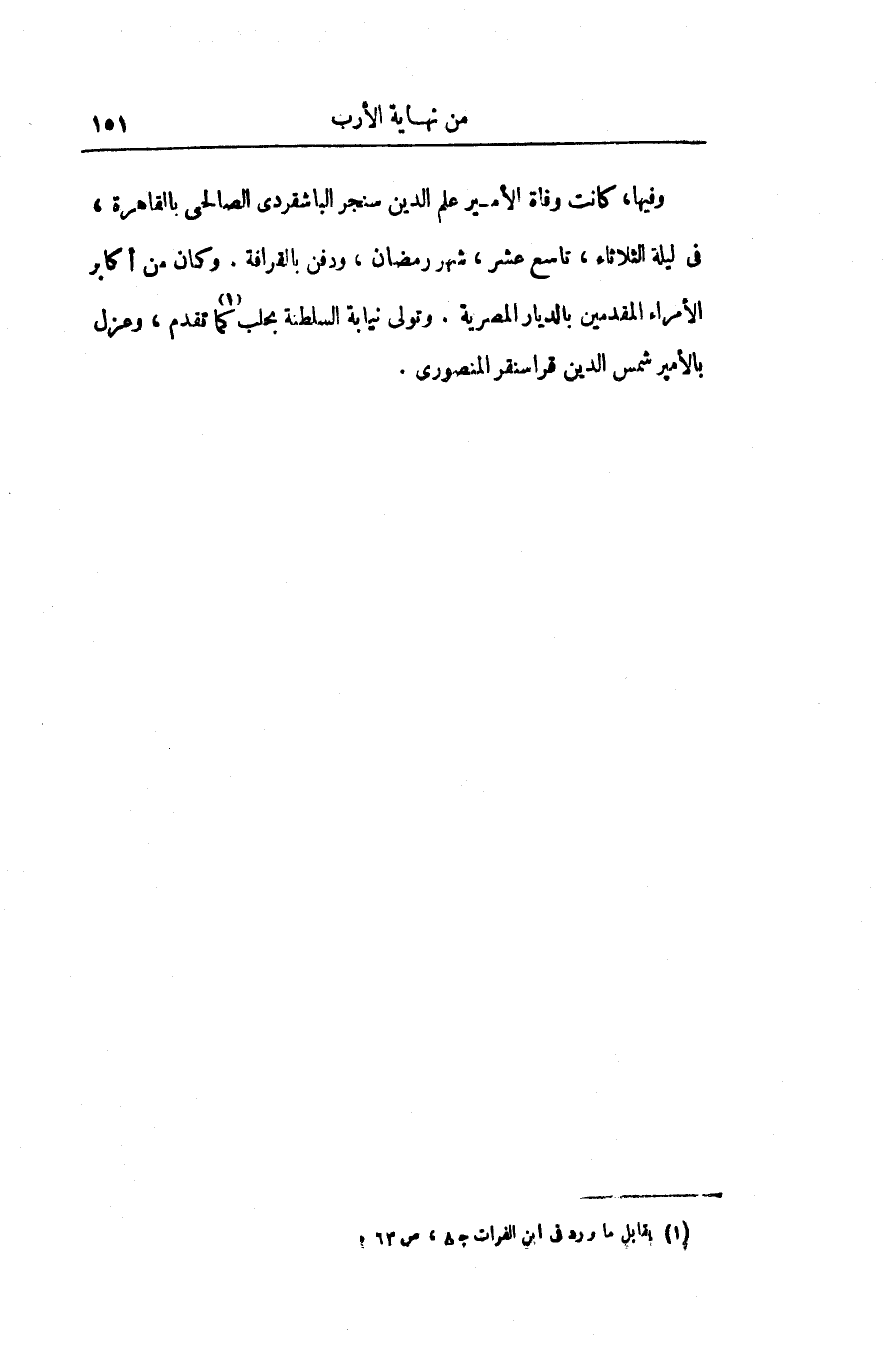 وفيها، كانت وفاة الأمير علم الدين سنجر الباشقردى الصالحى بالقاهرة، فى ليلة الثلاثاء، تاسع عشر، شهر رمضان، ودفن بالقرافة. وكان من أكابر الأمراء المقدمين بالديار المصرية. وتولى نيابة السلطنة بحلب «1» كما تقدم، وعزل بالأمير شمس الدين قراسنقر المنصورى.