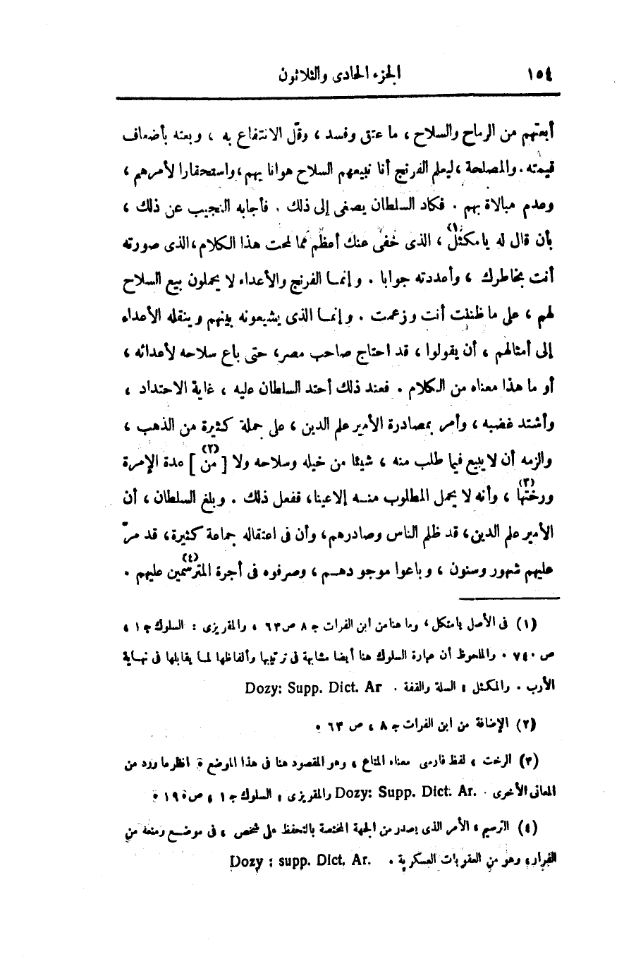 أبعتهم من الرماح والسلاح، ما عتق وفسد، وقلّ الانتفاع به، وبعته بأضعاف قيمته. والمصلحة، ليعلم الفرنج أنا نبيعهم السلاح هوانا بهم، واستحقارا لأمرهم، وعدم مبالاة بهم. فكاد السلطان يصغى إلى ذلك. فأجابه النجيب عن ذلك، بأن قال له يا مكثل «1» ، الذى خفى عنك أعظم مما لمحت هذا الكلام، الذى صورته أنت بخاطرك، وأعددته جوابا. وإنما الفرنج والأعداء لا يحملون بيع السلاح لهم، على ما ظننت أنت وزعمت. وإنما الذى يشيعونه بينهم وينقله الأعداء إلى أمثالهم، أن يقولوا، قد احتاج صاحب مصر، حتى باع سلاحه لأعدائه، أو ما هذا معناه من الكلام. فعند ذلك أحتد السلطان عليه، غاية الاحتداد، وأشتد غضبه، وأمر بمصادرة الأمير علم الدين، على جملة كثيرة من الذهب، والزمه أن لا يبيع فيما طلب منه، شيئا من خيله وسلاحه ولا [من «2» ] عدة الإمرة ورختها «3» ، وأنه لا يحمل المطلوب منه إلا عينا، قفعل ذلك. وبلغ السلطان، أن الأمير علم الدين، قد ظلم الناس وصادرهم، وأن فى اعتقاله جماعة كثيرة، قد مرّ عليهم شهور وسنون، وباعوا موجودهم، وصرفوه فى أجرة المترسمين «4» عليهم.