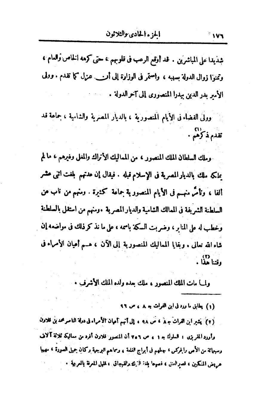 وملك السلطان الملك المنصور، من المماليك الأتراك والمغل وغيرهم، ما لم يملكه ملك بالديار المصرية فى الإسلام قبله. فيقال إن عدتهم بلغت اثنى عشر ألفا، وتأمّر منهم فى الأيام المنصورية جماعة كثيرة. ومنهم من ناب عن السلطنة الشريفة فى الممالك الشامية والديار المصرية. ومنهم من استقل بالسلطنة وخطب له على المنابر، وضربت السكة باسمه، على ما نذكر ذلك فى مواضعه إن شاء الله تعالى. وبقايا المماليك المنصورية إلى الآن، هم أعيان الأمراء فى وقتنا هذا «2» .