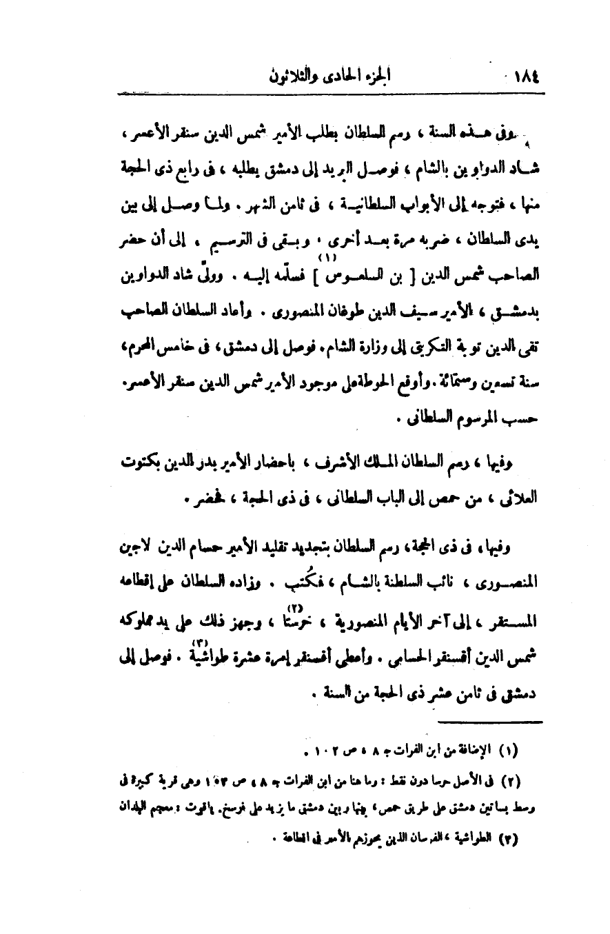 وفيها، فى ذى الحجة، رسم السلطان بتجديد تقليد الأمير حسام الدين لاجين المنصورى، نائب السلطنة بالشام، فكتب. وزاده السلطان على إقطاعه المستقر، إلى آخر الأيام المنصورية، خرستا «2» ، وجهز ذلك على يد مملوكه شمس الدين أقسنقر الحسامى. وأعطى أقسنقر إمرة عشرة طواشية «3» . فوصل إلى دمشق فى ثامن عشر ذى الحجة من السنة.