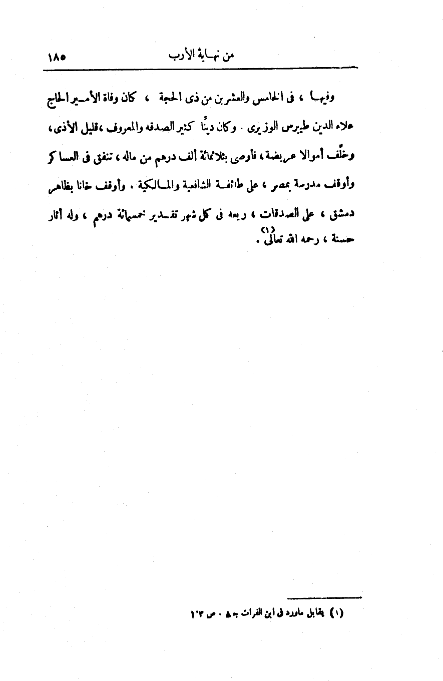 وفيها، فى الخامس والعشرين من ذى الحجة، كان وفاة الأمير الحاج علاء الدين طيبرس الوزيرى. وكان ديّنا كثير الصدقه والمعروف، قليل الأذى، وخلّف أموالا عريضة، فأوصى بثلاثمائة ألف درهم من ماله، تنفق فى العساكر وأوقف مدرسة بمصر، على طائفة الشافعية والمالكية. وأوقف خانا بظاهر دمشق، على الصدقات، ريعه فى كل شهر تقدير خمسمائة درهم، وله أثار حسنة، رحمه الله تعالى «1» .