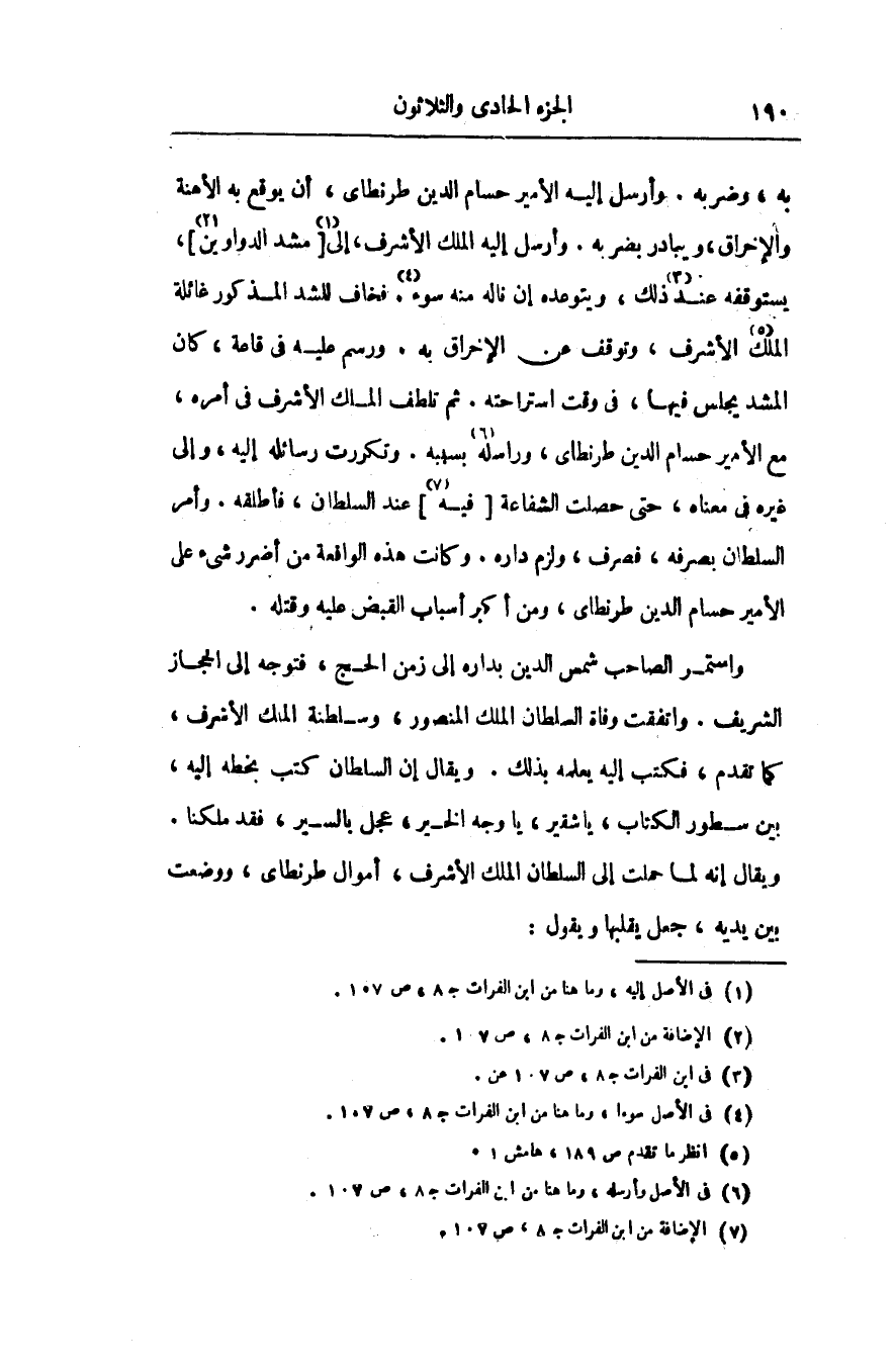به، وضربه. وأرسل إليه الأمير حسام الدين طرنطاى، أن يوقع به الأهنة والإخراق، ويبادر بضربه. وأرسل إليه الملك الأشرف، إلى «1» [مشد الدواوين «2» ] ، يستوقفه عند «3» ذلك، ويتوعده إن ناله منه سوء «4» . فخاف للشد المذكور غائلة الملك «5» الأشرف، وتوقف عن الإخراق به. ورسم عليه فى قاعة، كان المشد يجلس فيها، فى وقت استراحته. ثم تلطف الملك الأشرف فى أمره، مع الأمير حسام الدين طرنطاى، وراسله «6» بسببه. وتكررت رسائله إليه، وإلى غيره فى معناه، حتى حصلت الشفاعة [فيه «7» ] عند السلطان، فأطلقه. وأمر السلطان بصرفه، فصرف، ولزم داره. وكانت هذه الواقعة من أضرر شىء على الأمير حسام الدين طرنطاى، ومن أكبر أسباب القبض عليه وقتله.