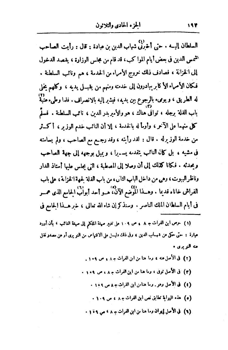 فكان الأمراء الأكابر يبادرون إلى خدمته ومنهم من يقبل يديه، وكلهم يخلى له الطريق، ويومىء بالرجوع بين يديه، فيشير إليه بالانصراف. فلما وطىء عتبة «2» باب القلة برجله، توافى «3» هناك، هو والأمير بدر الدين، نائب السلطنة. فسلّم كل منهما على الآخر، وأومأ له بالخدمة، إلا أن النائب خدم الوزير، أكثر من خدمة الوزير له. قال: لقد رأيته، وقد رجع مع الصاحب، ولم يسامته فى مشيه، بل كان النائب يتقدمه يسيرا، ويميل بوجهه إلى جهة الصاحب ويحدثه. فكانا كذلك إلى أن وصلا إلى المصطبة، التى يجلس عليها أستاذ الدار وناظر البيوت، وهى من داخل الباب الثانى، من باب القلة لجهة الخزانة، على باب الفراش خاناه قديما. وهذا الموضع «4» الآن «5» ، هو أحد أبواب «6» الجامع الذى عمر فى أيام السلطان الملك الناصر. وسنذكر إن شاء الله تعالى، خبر هذا الجامع فى