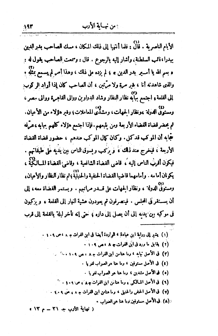 فيكون أقرب الناس إليه، قاضى القضاة الشافعية، وقاضى القضاة المالكية «6» ، يكونان أمامه. وأمامهما قاضيا القضاة الحنفية والحنبلية «7» ؛ ثم نظار النظار والأعيان، ومستوفى «8» الدولة، ونظار الجهات على قدر مراتبهم. ويستمر القضاة معه، إلى أن يستقر فى المجلس. فينصرفون ثم يعودون عشية النهار إلى القلعة، ويركبون فى موكبه بين يديه إلى أن يصل إلى داره؛ حتى إنه تأخر ليلة بالقلعة إلى قرب