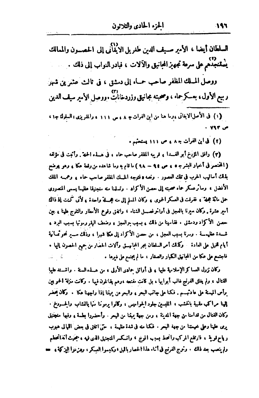ووصل الملك المظفر صاحب حماه إلى دمشق، فى ثالث عشرين شهر ربيع الأول، بعسكر حماه، وصحبته مجانيق وزردخانات «3» ، ووصل الأمير سيف الدين