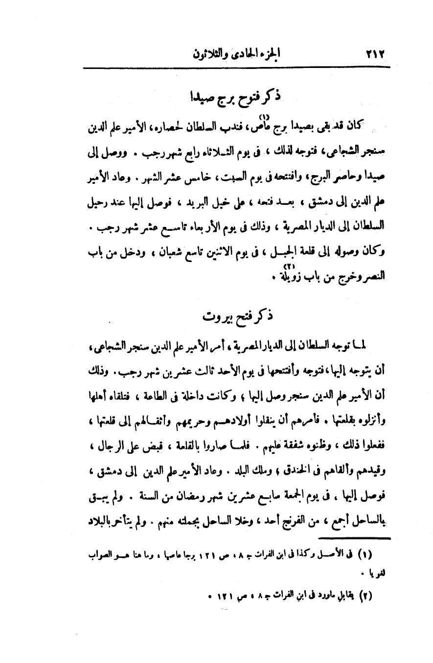 كان قد بقى بصيدا برج عاص «1» ، فندب السلطان لحصاره، الأمير علم الدين سنجر الشجاعى، فتوجه لذلك، فى يوم الثلاثاء رابع شهر رجب. ووصل إلى صيدا وحاصر البرج، وافتتحه فى يوم السبت، خامس عشر الشهر. وعاد الأمير علم الدين إلى دمشق، بعد فتحه، على خيل البريد، فوصل إليها عند رحيل السلطان إلى الديار المصرية، وذلك فى يوم الأربعاء تاسع عشر شهر رجب.