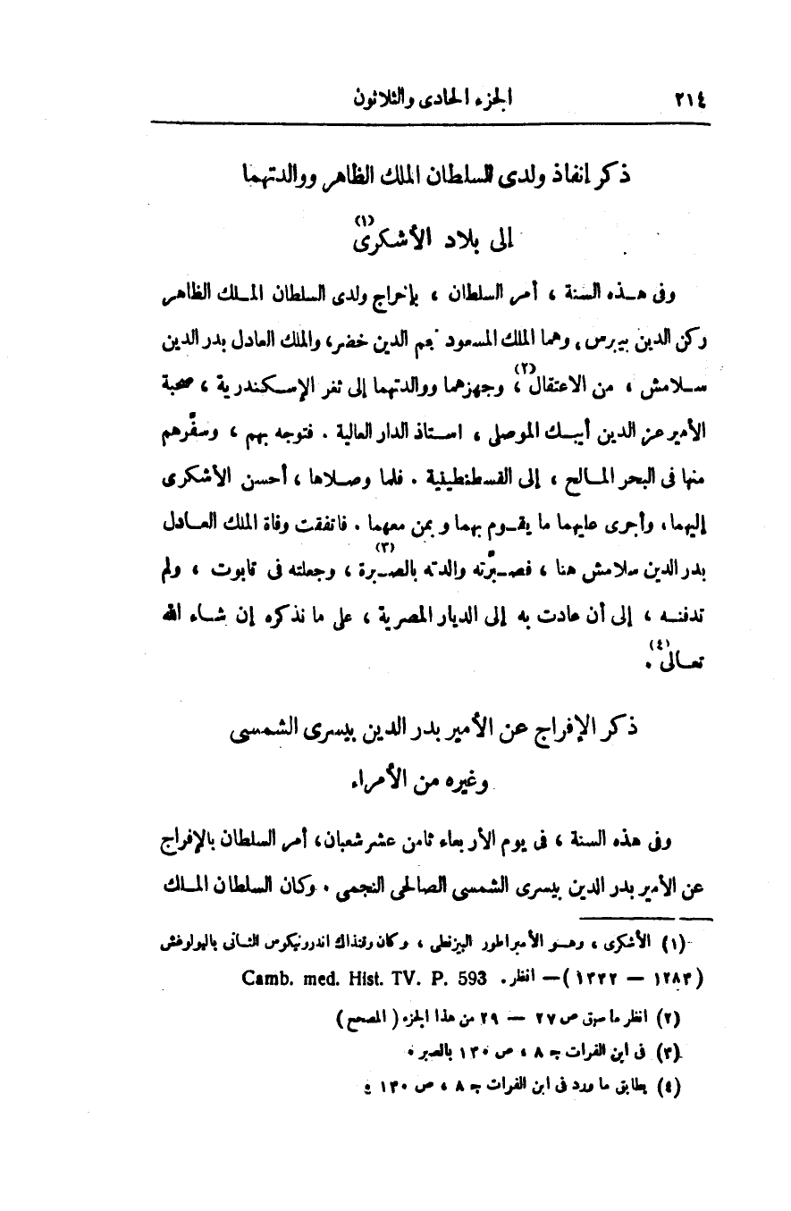 وفى هذه السنة، أمر السلطان، بإخراج ولدى السلطان الملك الظاهر ركن الدين بيبرس، وهما الملك المسعود نجم الدين خضر، والملك العادل بدر الدين سلامش، من الاعتقال «2» ، وجهزهما ووالدتهما إلى ثغر الإسكندرية، صحبة الأمير عز الدين أيبك الموصلى، استاذ الدار العالية. فتوجه بهم، وسفّرهم منها فى البحر المالح، إلى القسطنطينية. فلما وصلاها، أحسن الأشكرى إليهما، وأجرى عليهما ما يقوم بهما وبمن معهما. فاتفقت وفاة الملك العادل بدر الدين سلامش هنا، فصبّرته والدته بالصبرة «3» ، وجعلته فى تابوت، ولم تدفنه، إلى أن عادت به إلى الديار المصرية، على ما نذكره إن شاء الله تعالى «4» .
