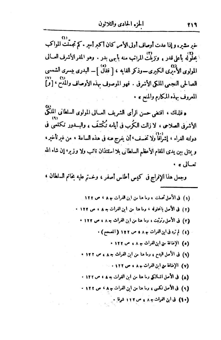«فلذلك، اقتضى حسن الرأى الشريف العالى المولوى السلطانى الملكى «8» الأشرفى الصلاحى، لا زالت الكرب فى أيامه تكشف، والبدور تكتمى «9» فى دولته الغراء، إشراقا «10» ولا تخسف، أن يفرج عنه فى هذه الساعة، من غير تأخير، ويمثل بين يدى المقام الأعظم السلطانى بلا استئذان نائب ولا وزير، إن شاء الله تعالى» .