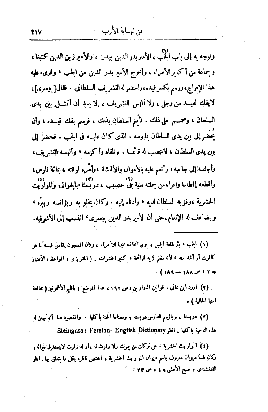 وتوجه به إلى باب الجب «1» ، الأمير بدر الدين بيدرا، والأمير زين الدين كتبغا، وجماعة من أكابر الأمراء. وأخرج الأمير بدر الدين من الجب، وقرىء عليه هذا الإفراج، ورسم بكسر قيده، واحضر له التشريف السلطانى. فقال [بيسرى] :