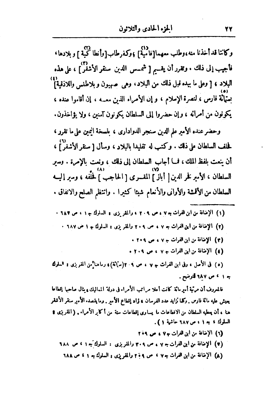 وكانتا قد أخذنا منه، وطلب معهما [فامية «1» ] ؛ وكفر طاب [وأنطاكية «2» ] وبلادها، فأجيب إلى ذلك. وتقرر أن يقيم [شمس الدين سنقر الأشقر «3» ] ، على هذه البلاد، [وعلى ما بيده قبل ذلك من البلاد، وهى صهيون وبلاطلس واللاذقية «4» ] بستمائة «5» فارس، لنصرة الإسلام، وإن الأمراء الذين معه، إن أقاموا عنده، يكونون من أمرائه، وإن حضروا إلى السلطان يكونون آمنين، ولا يؤاخذون.