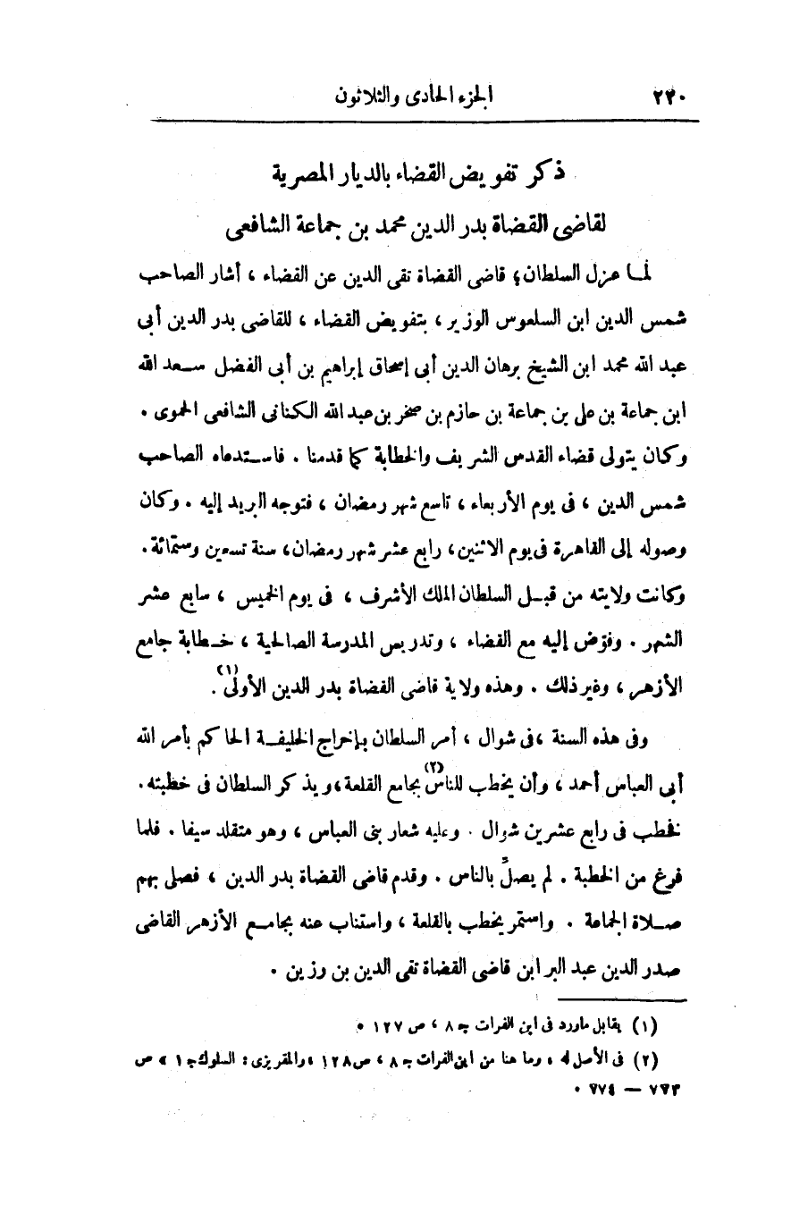 ذكر تفويض القضاء بالديار المصرية لقاضى القضاة بدر الدين محمد بن جماعة الشافعى